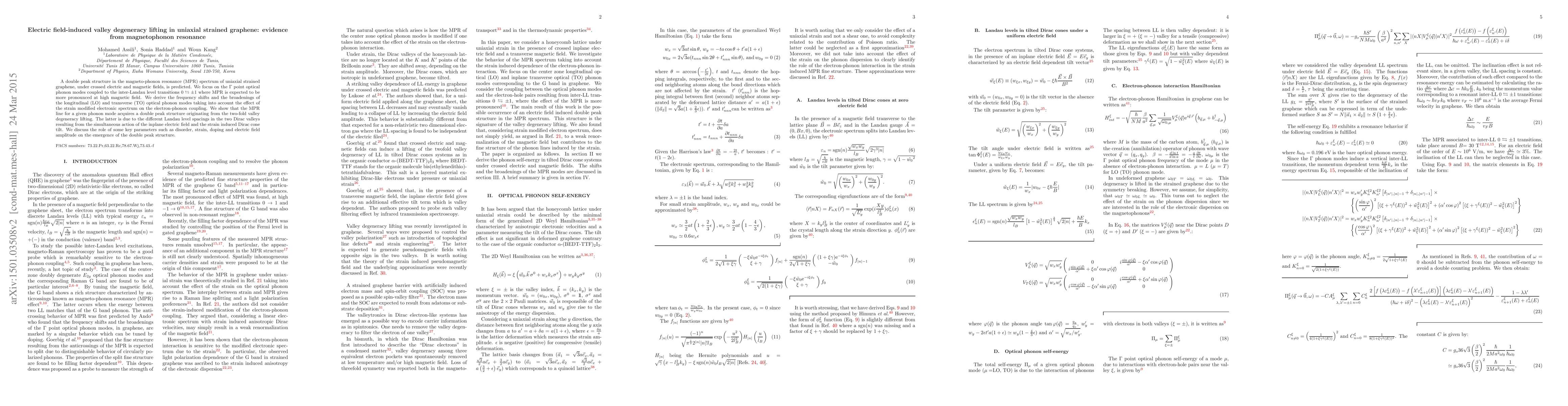 This paper investigates the magneto-phonon resonance in uniaxial strained graphene under electric and magnetic fields, revealing a double peak structure due to valley degeneracy lifting. The study highlights the influence of strain on the electronic spectrum and its impact on electron-phonon coupling, leading to distinct resonance lines.