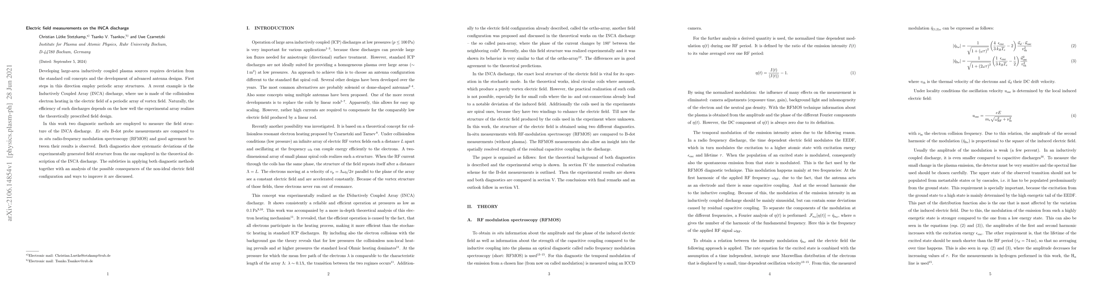 This paper investigates the electric field measurements in the INCA discharge, employing both B-dot probe and RFMOS diagnostics. It finds systematic deviations from the theoretical design, discussing the implications and potential improvements.