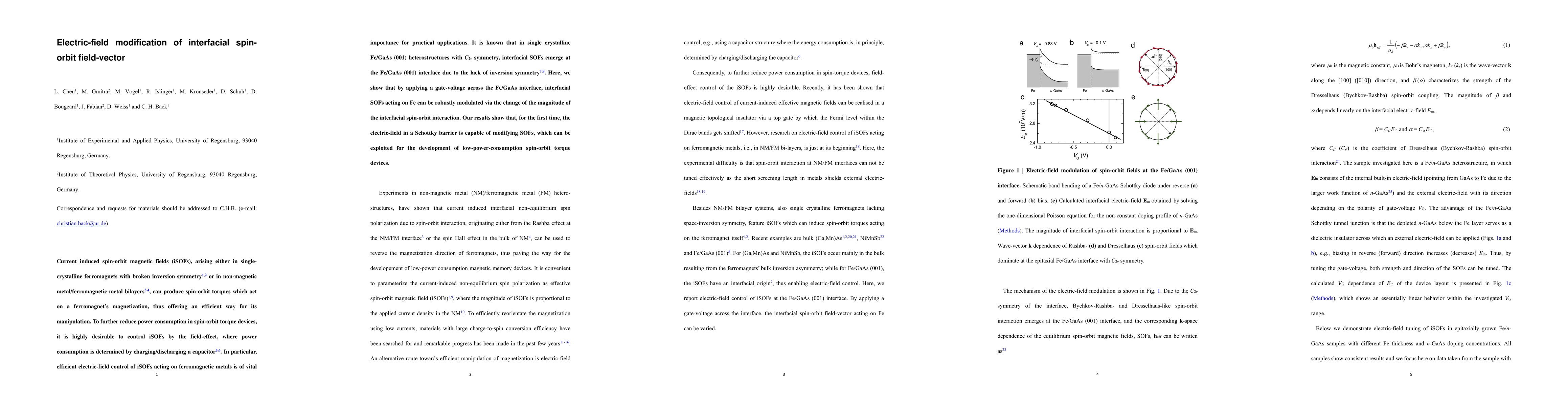 Current induced spin-orbit magnetic fields (iSOFs), arising either in single-crystalline ferromagnets with broken inversion symmetry1,2 or in non-magnetic metal/ferromagnetic metal bilayers3,4, can produce spin-orbit torques which act on a ferromagnet's magnetization,thus offering an efficient way for its manipulation.To further reduce power consumption in spin-orbit torque devices, it is highly desirable to control iSOFs by the field-effect, where power consumption is determined by charging/discharging a capacitor5,6. In particular, efficient electric-field control of iSOFs acting on ferromagnetic metals is of vital importance for practical applications. It is known that in single crystalline Fe/GaAs (001) heterostructures with C2v symmetry, interfacial SOFs emerge at the Fe/GaAs (001) interface due to the lack of inversion symmetry7,8. Here, we show that by applying a gate-voltage across the Fe/GaAs interface, interfacial SOFs acting on Fe can be robustly modulated via the change of the magnitude of the interfacial spin-orbit interaction. Our results show that, for the first time, the electric-field in a Schottky barrier is capable of modifying SOFs, which can be exploited for the development of low-power-consumption spin-orbit torque devices.