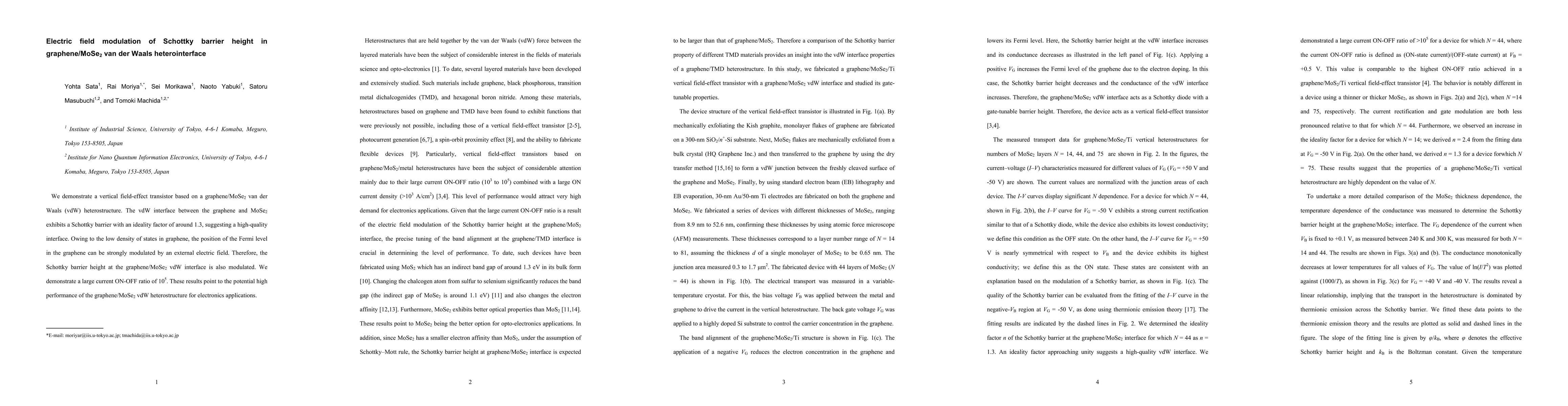 This paper reports on a vertical field-effect transistor utilizing a high-quality graphene/MoSe2 van der Waals heterointerface, showing modulation of the Schottky barrier height by an external electric field, resulting in a large current ON-OFF ratio of 10^5, highlighting its potential for advanced electronic applications.