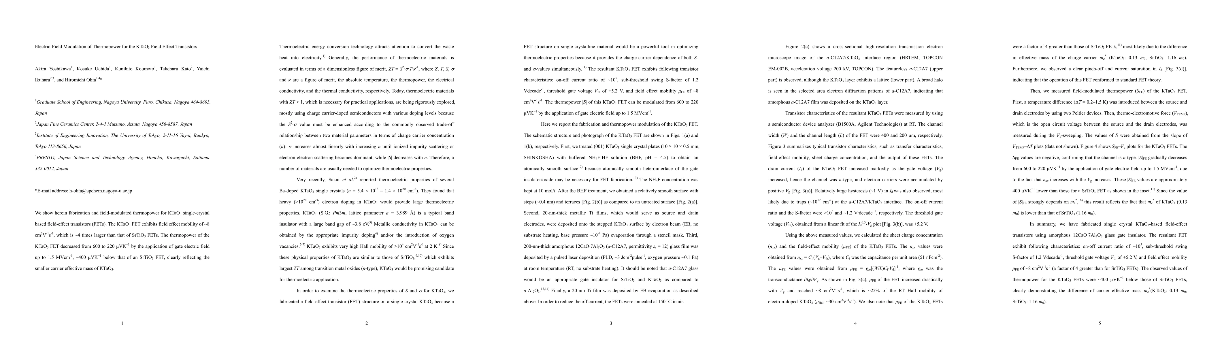 This paper details the fabrication of KTaO3 single-crystal field-effect transistors (FETs) showing enhanced field-effect mobility compared to SrTiO3 FETs. The thermopower of KTaO3 FETs significantly decreases under gate electric fields, indicating a smaller carrier effective mass.