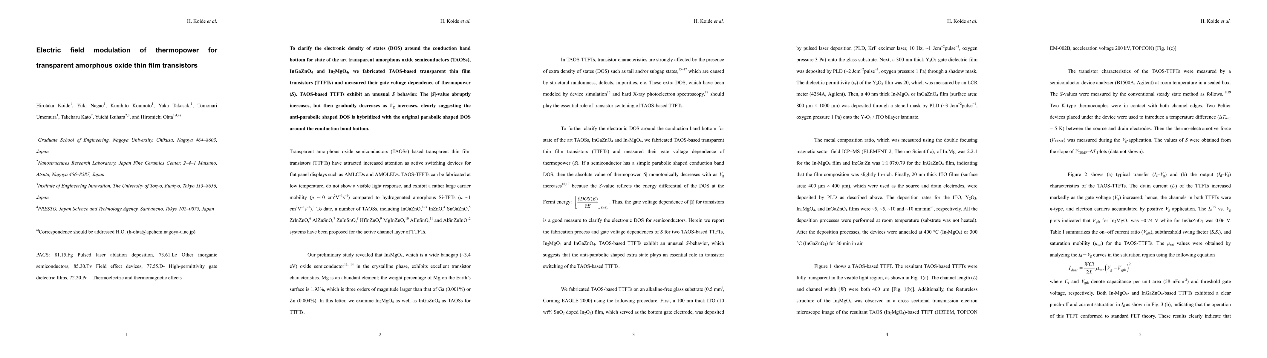 To clarify the electronic density of states (DOS) around the conduction band bottom for state of the art transparent amorphous oxide semiconductors (TAOSs), InGaZnO4 and In2MgO4, we fabricated TAOS-based transparent thin film transistors (TTFTs) and measured their gate voltage dependence of thermopower (S). TAOS-based TTFTs exhibit an unusual S behavior. The |S|-value abruptly increases, but then gradually decreases as Vg increases, clearly suggesting the anti-parabolic shaped DOS is hybridized with the original parabolic shaped DOS around the conduction band bottom.