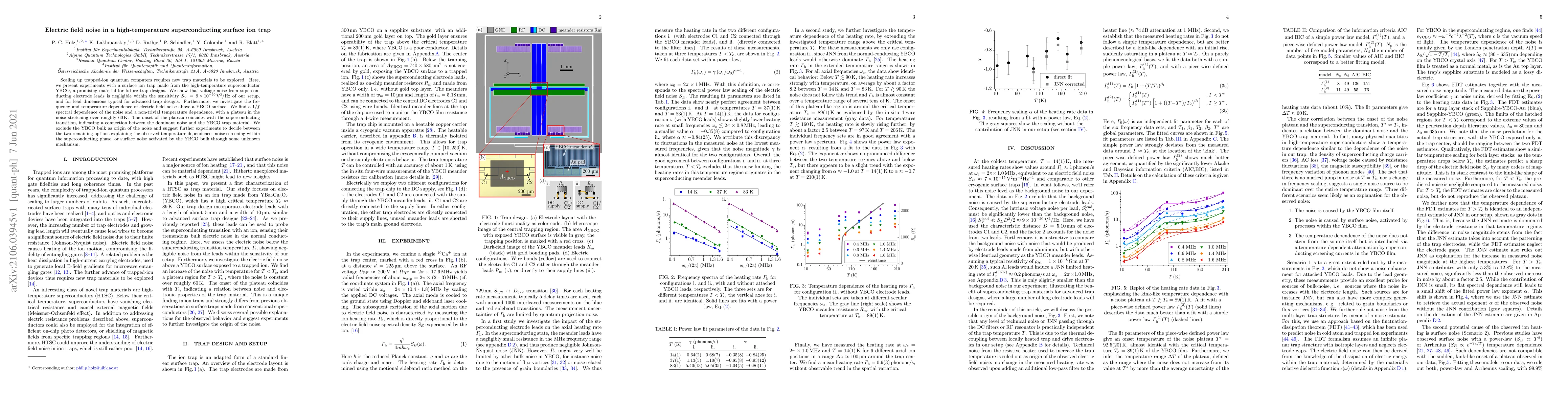 Scaling up trapped-ion quantum computers requires new trap materials to be explored. Here, we present experiments with a surface ion trap made from the high-temperature superconductor YBCO, a promising material for future trap designs. We show that voltage noise from superconducting electrode leads is negligible within the sensitivity $S_V=9\times 10^{-20}\,\mathrm{V}^2\mathrm{Hz}^{-1}$ of our setup, and for lead dimensions typical for advanced trap designs. Furthermore, we investigate the frequency and temperature dependence of electric field noise above a YBCO surface. We find a $1/f$ spectral dependence of the noise and a non-trivial temperature dependence, with a plateau in the noise stretching over roughly $60\,\mathrm{K}$. The onset of the plateau coincides with the superconducting transition, indicating a connection between the dominant noise and the YBCO trap material. We exclude the YBCO bulk as origin of the noise and suggest further experiments to decide between the two remaining options explaining the observed temperature dependence: noise screening within the superconducting phase, or surface noise activated by the YBCO bulk through some unknown mechanism.