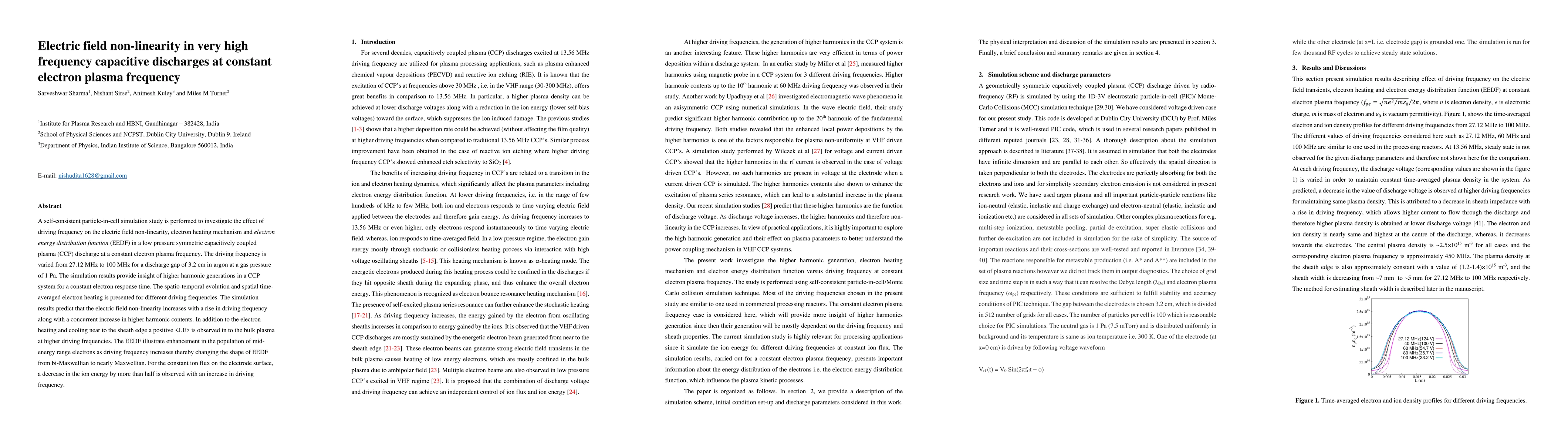 This study uses self-consistent particle-in-cell simulations to explore the impact of varying driving frequencies on electric field non-linearity, electron heating, and energy distribution in low-pressure capacitively coupled plasma discharges. Results show increased electric field non-linearity and higher harmonic generation with higher frequencies, along with changes in electron energy distribution and reduced ion energies.