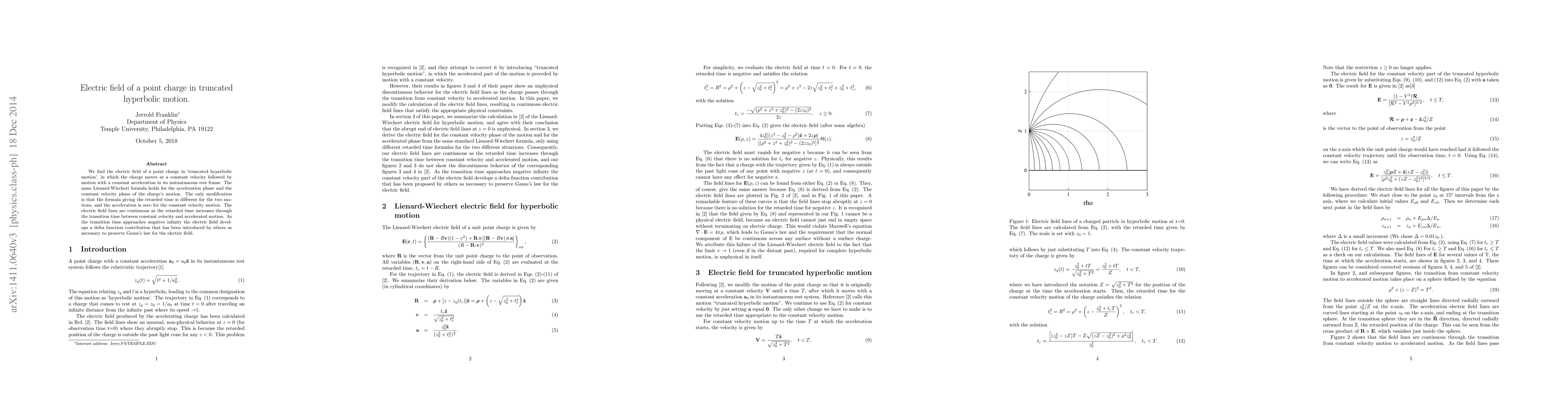This paper investigates the electric field of a point charge undergoing truncated hyperbolic motion, where the charge first moves at a constant velocity then accelerates in its instantaneous rest frame. The Lienard-Wiechert formula applies to both phases, with a modified retarded time calculation, and the electric field lines remain continuous during the transition. As the transition time recedes to negative infinity, a delta function contribution emerges to uphold Gauss's law.