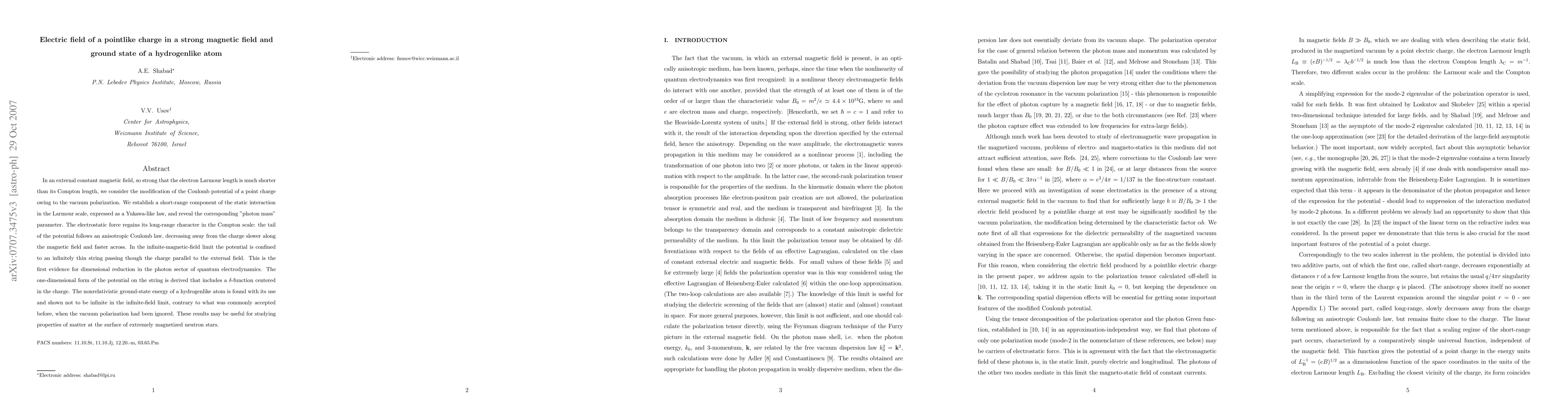 This paper investigates the electric field of a pointlike charge in a strong magnetic field, revealing a Yukawa-like short-range interaction due to vacuum polarization. It demonstrates dimensional reduction in quantum electrodynamics, showing the potential becomes a one-dimensional string in the infinite magnetic field limit, and resolves the nonrelativistic ground state energy of hydrogenlike atoms in such conditions.