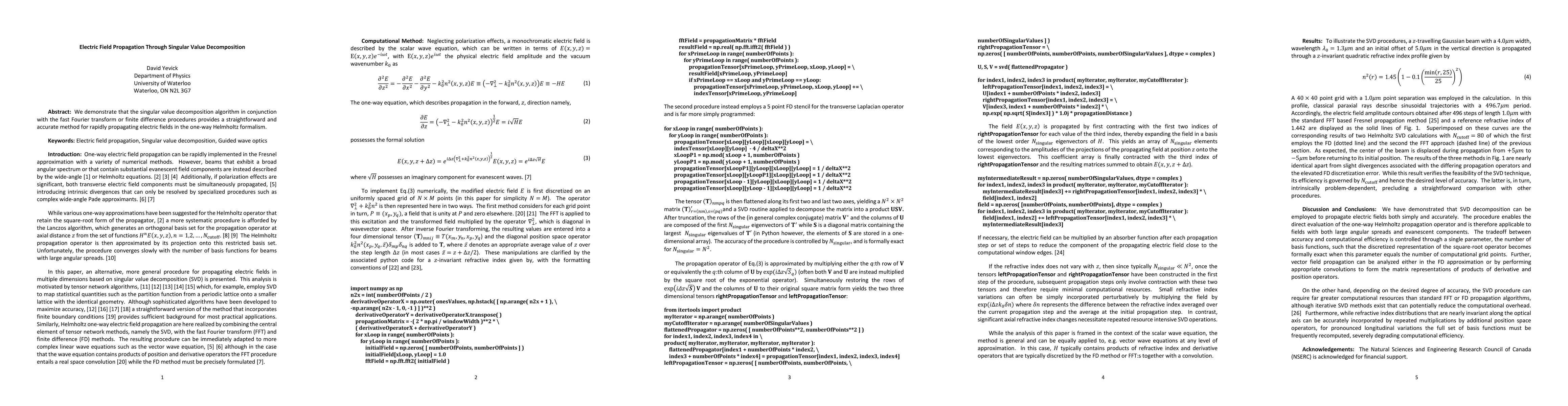 This paper presents a method using singular value decomposition (SVD) combined with fast Fourier transform or finite difference techniques to efficiently and accurately propagate electric fields in the one-way Helmholtz formalism. The approach offers a straightforward and rapid solution for electric field propagation.
