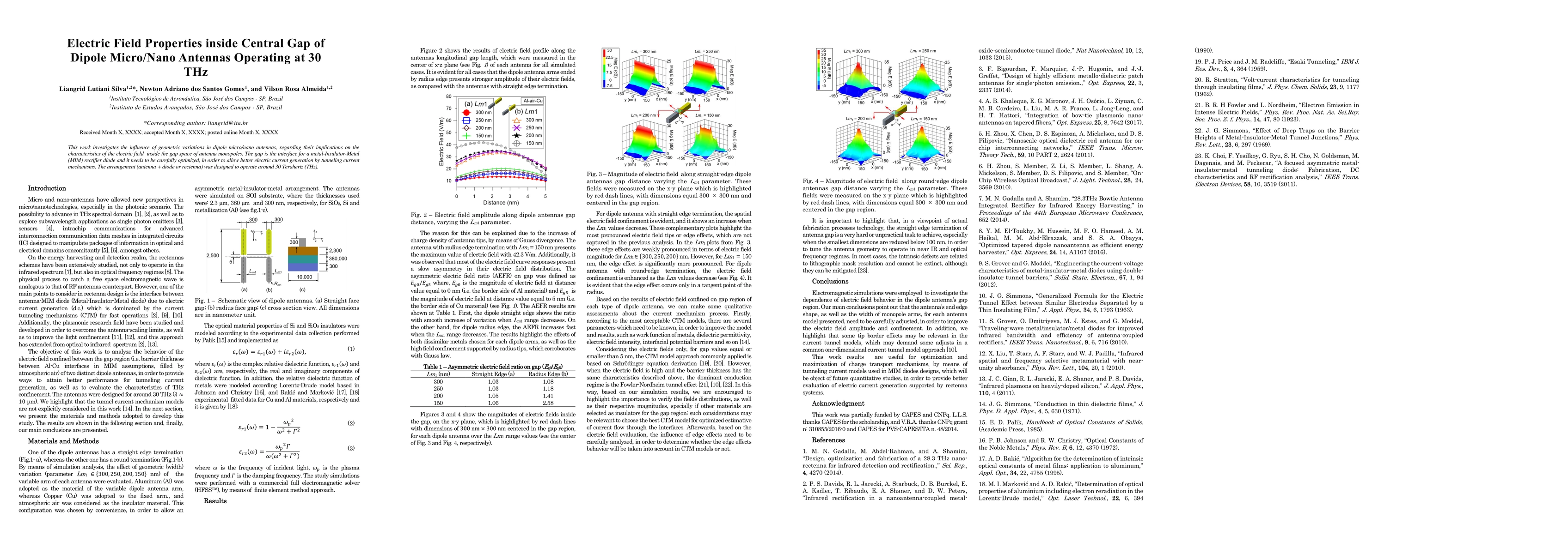 Researchers investigated the electric field properties inside a central gap of dipole micro/nano antennas operating at 30 THz, finding that geometric variations significantly impact current generation by tunneling mechanisms.