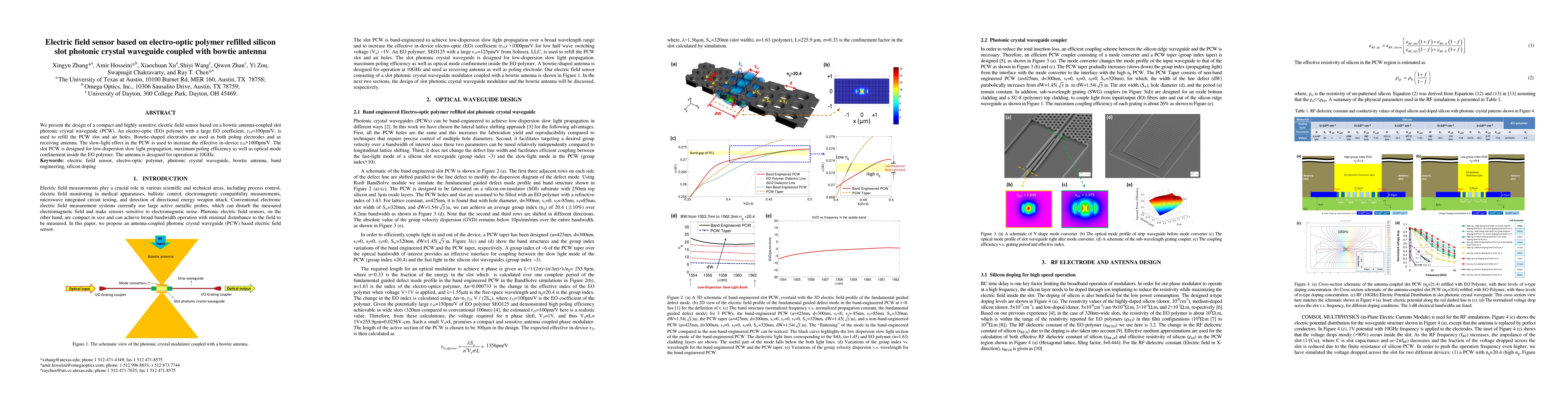 The research presents a design for a compact and highly sensitive electric field sensor based on a bowtie antenna-coupled slot photonic crystal waveguide (PCW) refilled with an electro-optic (EO) polymer. The PCW is band-engineered for low-dispersion slow light propagation, maximizing poling efficiency and optical mode confinement inside the EO polymer.