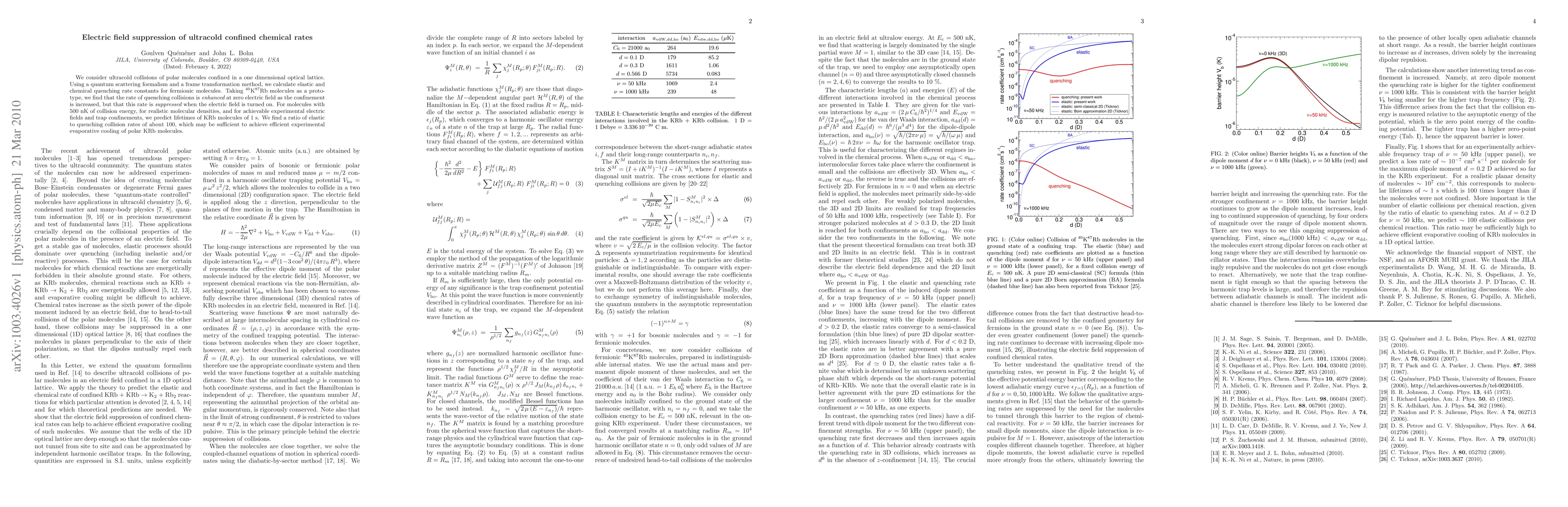 We consider ultracold collisions of polar molecules confined in a one dimensional optical lattice. Using a quantum scattering formalism and a frame transformation method, we calculate elastic and chemical quenching rate constants for fermionic molecules. Taking KRb molecules as a prototype, we find that the rate of quenching collisions is enhanced at zero electric field as the confinement is increased, but that this rate is suppressed when the electric field is turned on. For molecules with 500 nK of collision energy, for realistic molecular densities, and for achievable experimental electric fields and trap confinements, we predict lifetimes of KRb molecules of 1 s. We find a ratio of elastic to quenching collision rates of about 100, which may be sufficient to achieve efficient experimental evaporative cooling of polar KRb molecules.