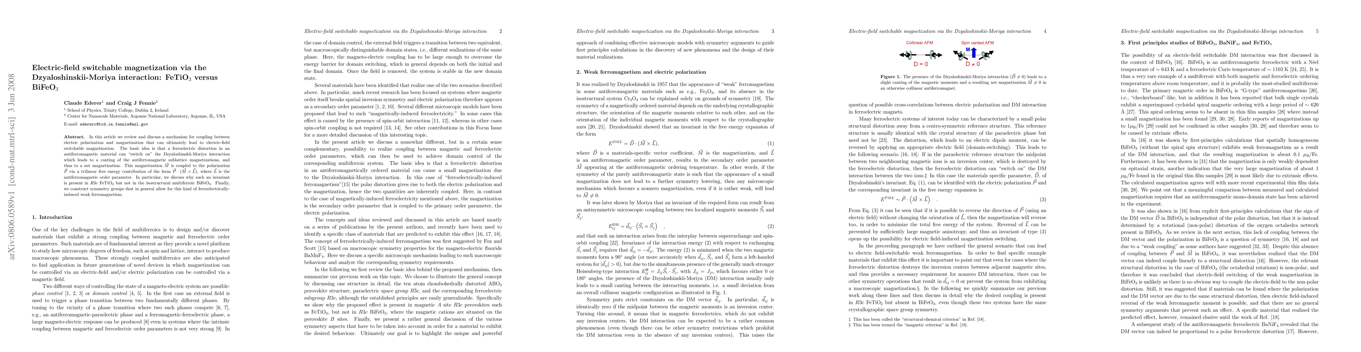 In this article we review and discuss a mechanism for coupling between electric polarization and magnetization that can ultimately lead to electric-field switchable magnetization. The basic idea is that a ferroelectric distortion in an antiferromagnetic material can "switch on" the Dzyaloshinskii-Moriya interaction which leads to a canting of the antiferromagnetic sublattice magnetizations, and thus to a net magnetization. This magnetization M is coupled to the polarization P via a trilinear free energy contribution of the form P(M x L), where L is the antiferromagnetic order parameter. In particular, we discuss why such an invariant is present in R3c FeTiO_3 but not in the isostructural multiferroic BiFeO_3. Finally, we construct symmetry groups that in general allow for this kind of ferroelectrically-induced weak ferromagnetism.