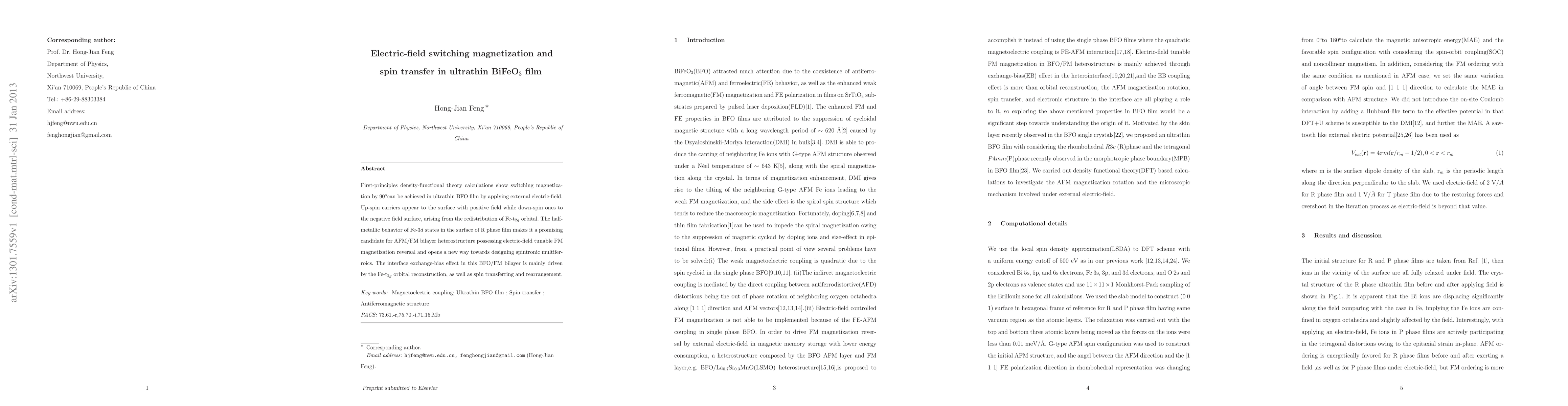 This study demonstrates that ultrathin BiFeO3 (BFO) films can switch magnetization by 90 degrees via external electric fields, with spin carriers redistributing due to Fe-t2g orbital changes. The half-metallic nature of Fe-3d states in the R phase film suggests potential for electric-field tunable spintronic applications.