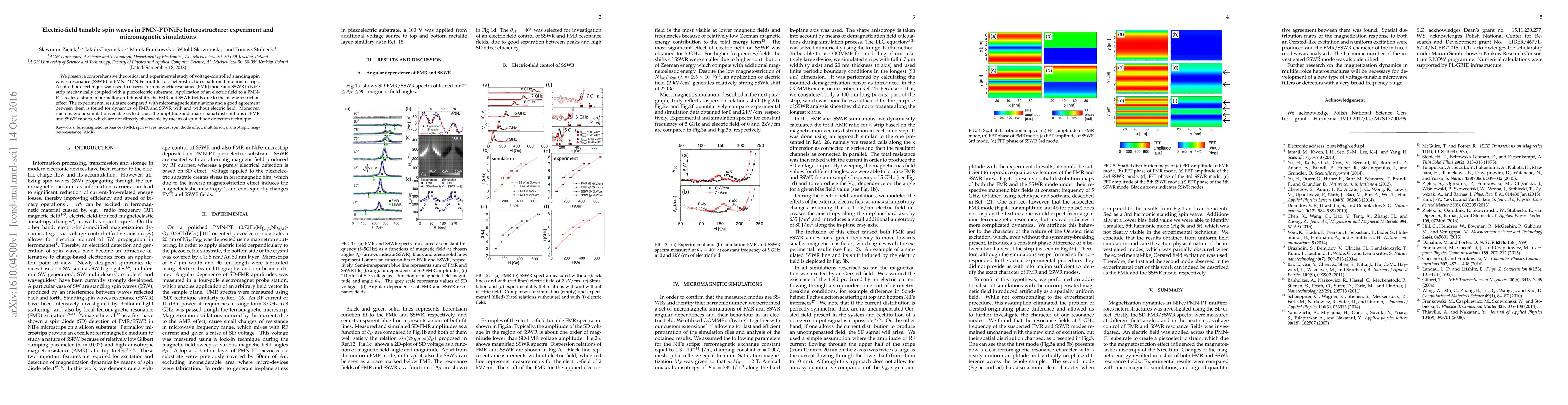 This paper investigates voltage-controlled spin waves in PMN-PT/NiFe heterostructures using both experimental and micromagnetic simulation methods. The study reveals that electric fields applied to PMN-PT induce strain in NiFe, shifting ferromagnetic resonance and spin wave resonance fields due to magnetostriction, with simulations corroborating experimental findings.