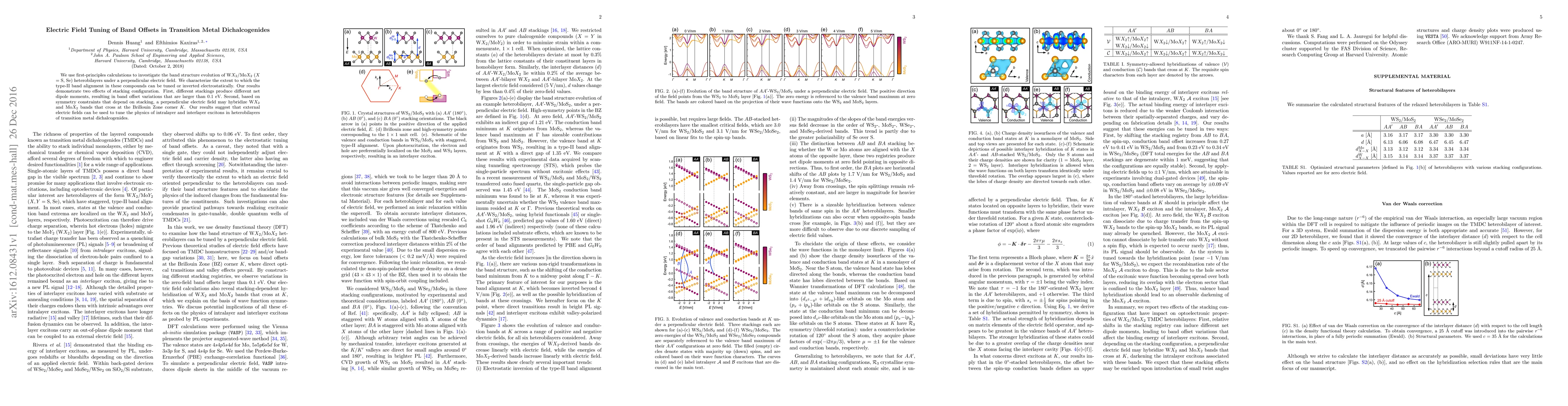 We use first-principles calculations to investigate the band structure evolution of W$X_2$/Mo$X_2$ ($X$ = S, Se) heterobilayers under a perpendicular electric field. We characterize the extent to which the type-II band alignment in these compounds can be tuned or inverted electrostatically. Our results demonstrate two effects of stacking configuration. First, different stackings produce different net dipole moments, resulting in band offset variations that are larger than 0.1 eV. Second, based on symmetry constraints that depend on stacking, a perpendicular electric field may hybridize W$X_2$ and Mo$X_2$ bands that cross at the Brillouin Zone corner $K$. Our results suggest that external electric fields can be used to tune the physics of intralayer and interlayer excitons in heterobilayers of transition metal dichalcogenides.