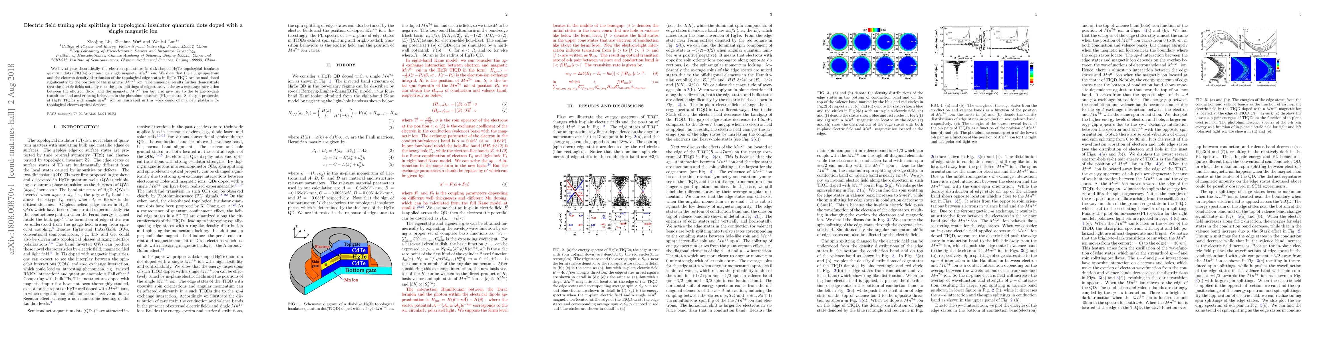 This paper theoretically explores how electric fields can modulate the spin splitting in HgTe topological insulator quantum dots containing a single $Mn^{2+}$ ion, demonstrating the potential for electric field tuning of spin states and the emergence of bright-to-dark transitions in photoluminescence spectra. The findings suggest a new platform for topological electro-optical devices.