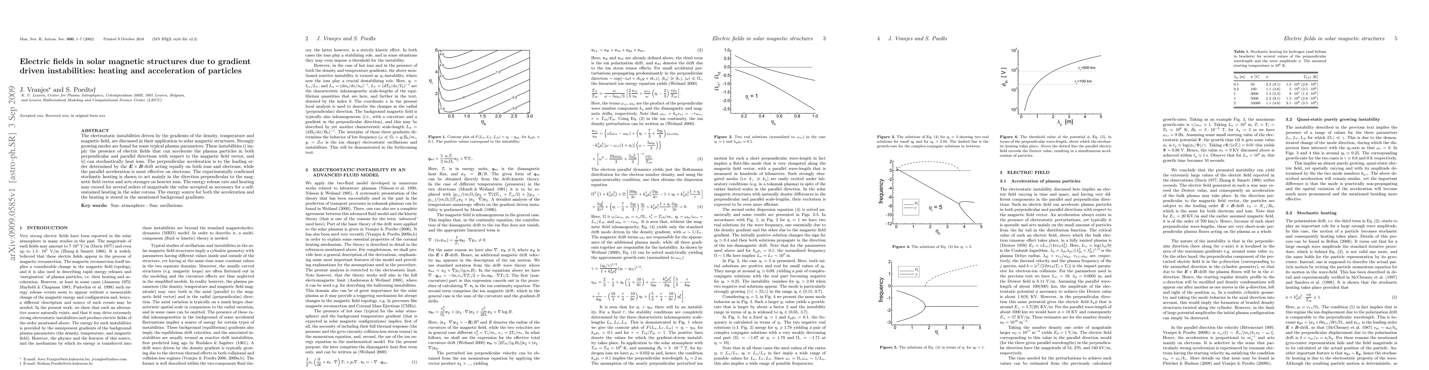 The electrostatic instabilities driven by the gradients of the density, temperature and magnetic field, are discussed in their application to solar magnetic structures. Strongly growing modes are found for some typical plasma parameters. These instabilities i) imply the presence of electric fields that can accelerate the plasma particles in both perpendicular and parallel directions with respect to the magnetic field vector, and ii) can stochastically heat ions. The perpendicular acceleration is to the leading order determined by the $\bmath{E}\times \bmath{B}$-drift acting equally on both ions and electrons, while the parallel acceleration is most effective on electrons. The experimentally confirmed stochastic heating is shown to act mainly in the direction perpendicular to the magnetic field vector and acts stronger on heavier ions. The energy release rate and heating may exceed for several orders of magnitude the value accepted as necessary for a self-sustained heating in the solar corona. The energy source for both the acceleration and the heating is stored in the mentioned background gradients.