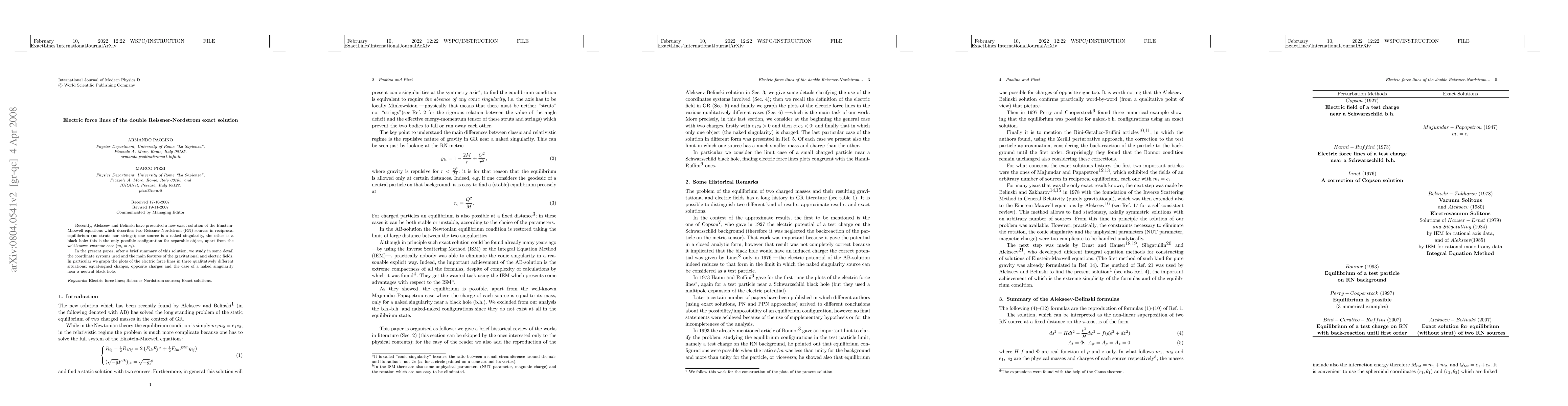 This paper examines the electric force lines of a new exact solution of the Einstein-Maxwell equations describing two Reissner-Nordström sources in equilibrium, including a naked singularity and a black hole. It analyzes the gravitational and electric fields in various configurations and graphically represents the electric force lines for equal-signed, opposite charges, and a naked singularity near a neutral black hole.