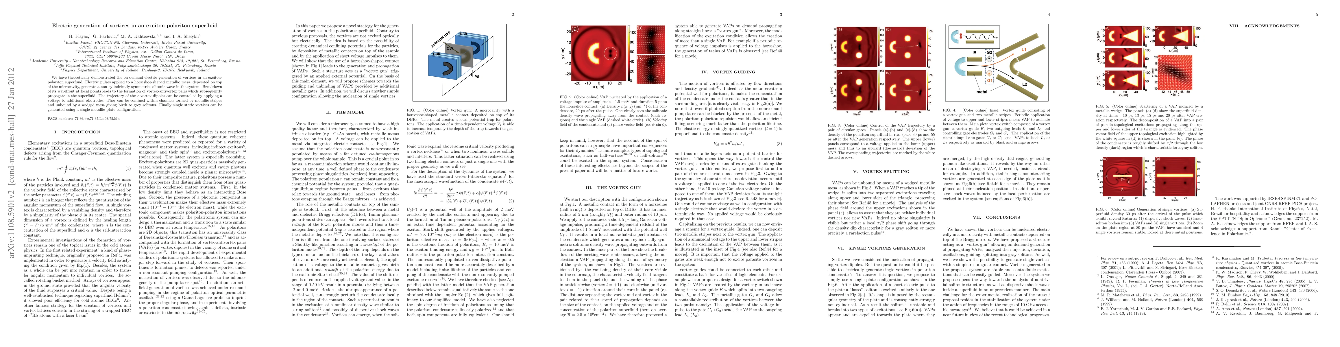 This paper demonstrates the electric generation of vortices in an exciton-polariton superfluid using applied electric pulses. Vortex-antivortex pairs are formed and their trajectories can be controlled via additional voltages, allowing for manipulation within metallic stripe channels.