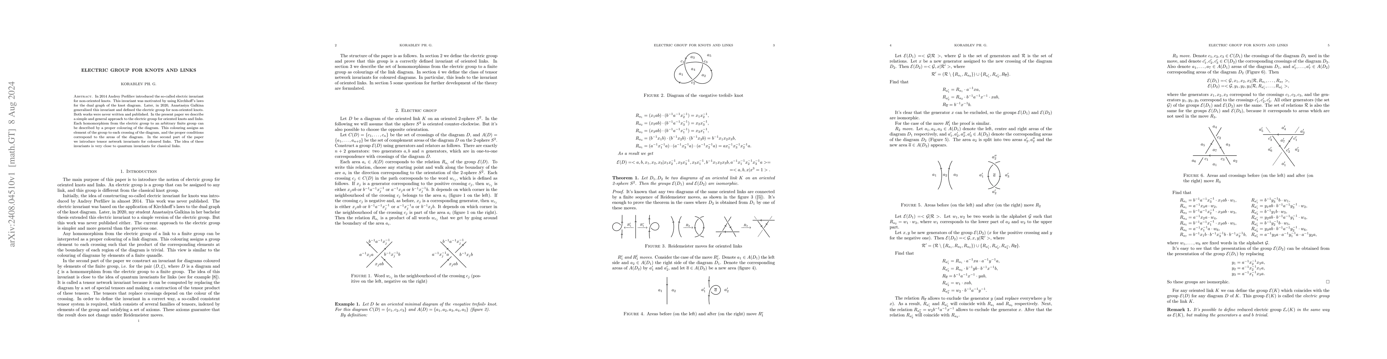 In 2014 Andrey Perfiliev introduced the so-called electric invariant for non-oriented knots. This invariant was motivated by using Kirchhoff's laws for the dual graph of the knot diagram. Later, in 2020, Anastasiya Galkina generalised this invariant and defined the electric group for non-oriented knots. Both works were never written and published. In the present paper we describe a simple and general approach to the electric group for oriented knots and links. Each homomorphism from the electric group to an arbitrary finite group can be described by a proper colouring of the diagram. This colouring assigns an element of the group to each crossing of the diagram, and the proper conditions correspond to the areas of the diagram. In the second part of the paper we introduce tensor network invariants for coloured links. The idea of these invariants is very close to quantum invariants for classical links.