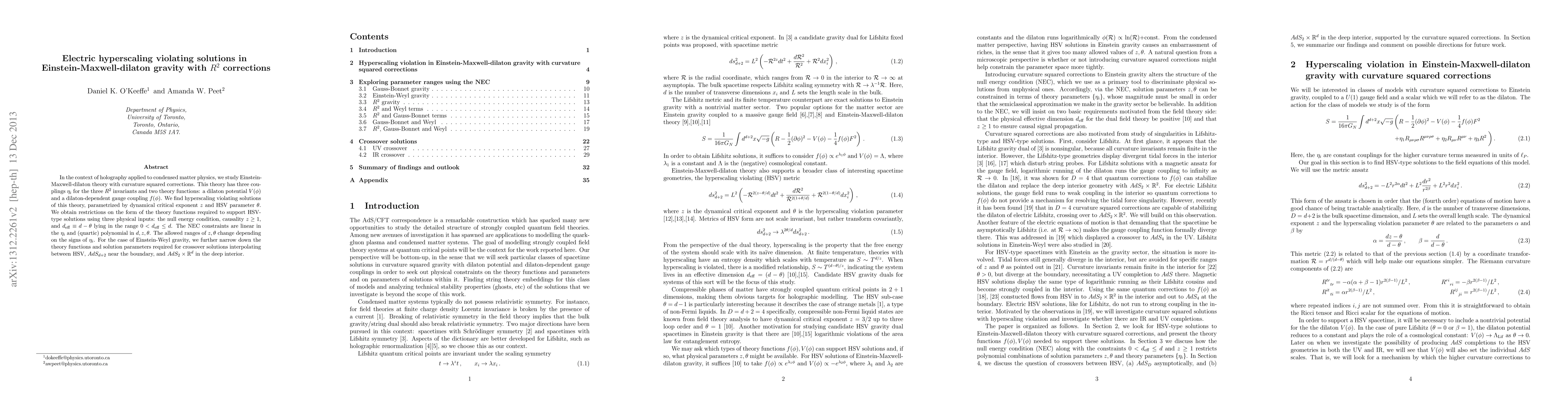 In the context of holography applied to condensed matter physics, we study Einstein-Maxwell-dilaton theory with curvature squared corrections. This theory has three couplings eta_i for the three R^2 invariants and two theory functions: a dilaton potential V(phi) and a dilaton-dependent gauge coupling f(phi). We find hyperscaling violating solutions of this theory, parametrized by dynamical critical exponent z and HSV parameter theta. We obtain restrictions on the form of the theory functions required to support HSV-type solutions using three physical inputs: the null energy condition, causality z $\leq$ 1, and d_eff = d - theta lying in the range 0 < d_eff $\leq$ d. The NEC constraints are linear in the eta_i and (quartic) polynomial in d,z,theta. The allowed ranges of z,theta change depending on the signs of eta_i. For the case of Einstein-Weyl gravity, we further narrow down the theory functions and solution parameters required for crossover solutions interpolating between HSV, AdS_d+2 near the boundary, and AdS_2 x R^d in the deep interior.