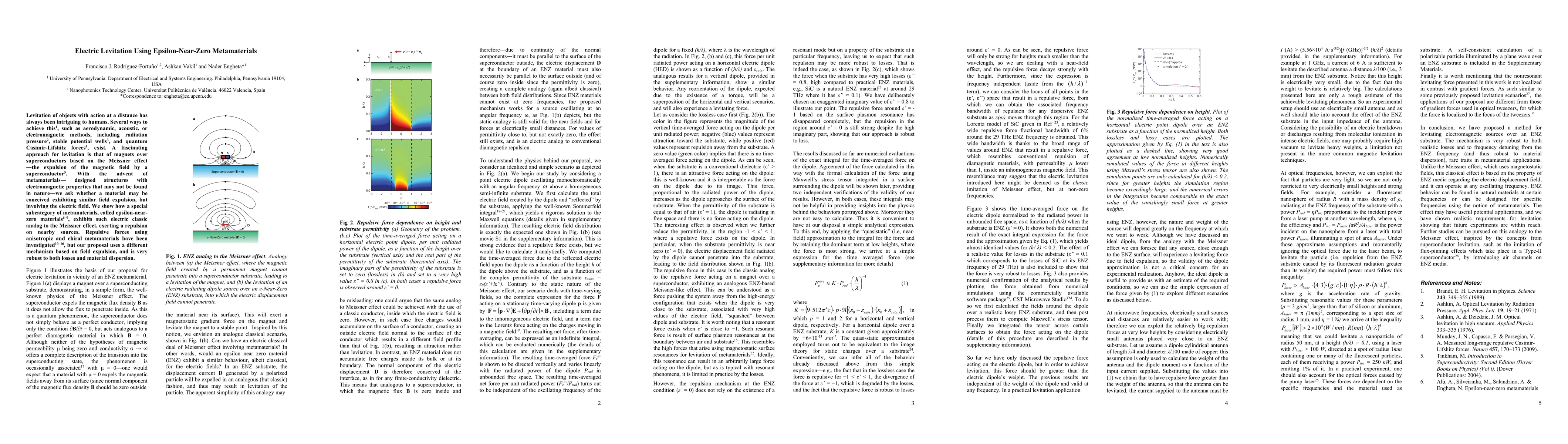 This paper explores electric levitation using epsilon-near-zero metamaterials, demonstrating a novel mechanism for repelling nearby sources and achieving levitation through electric field expulsion, akin to the Meissner effect for magnetic fields, and showing robustness against losses and dispersion.