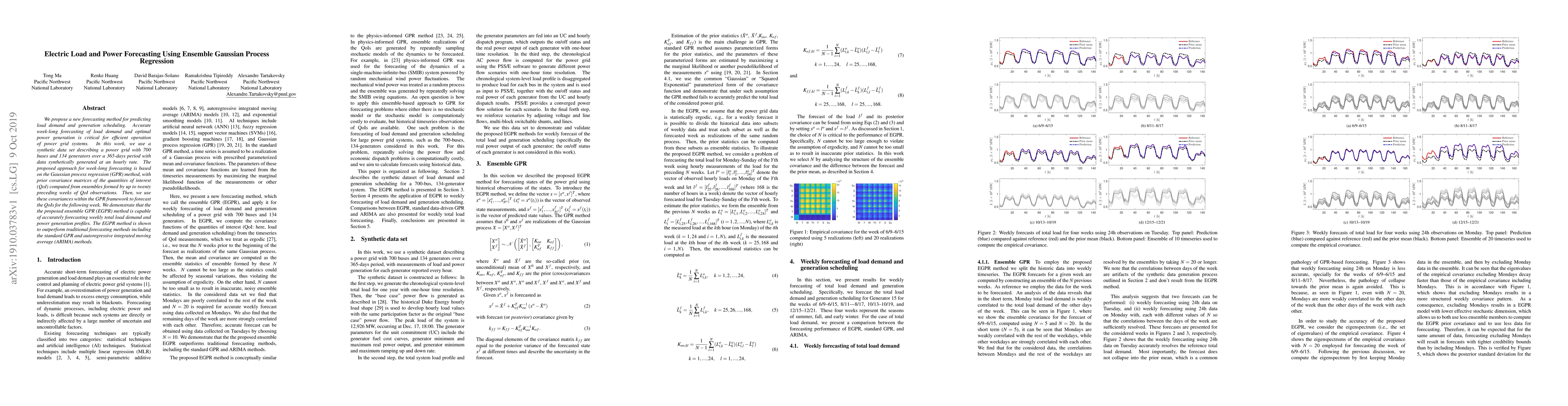 This paper proposes an ensemble Gaussian process regression (EGPR) method for accurate week-long forecasting of load demand and power generation in power grid systems. The EGPR method outperforms traditional forecasting techniques, demonstrating superior accuracy in predicting weekly total load demand and generation profiles.