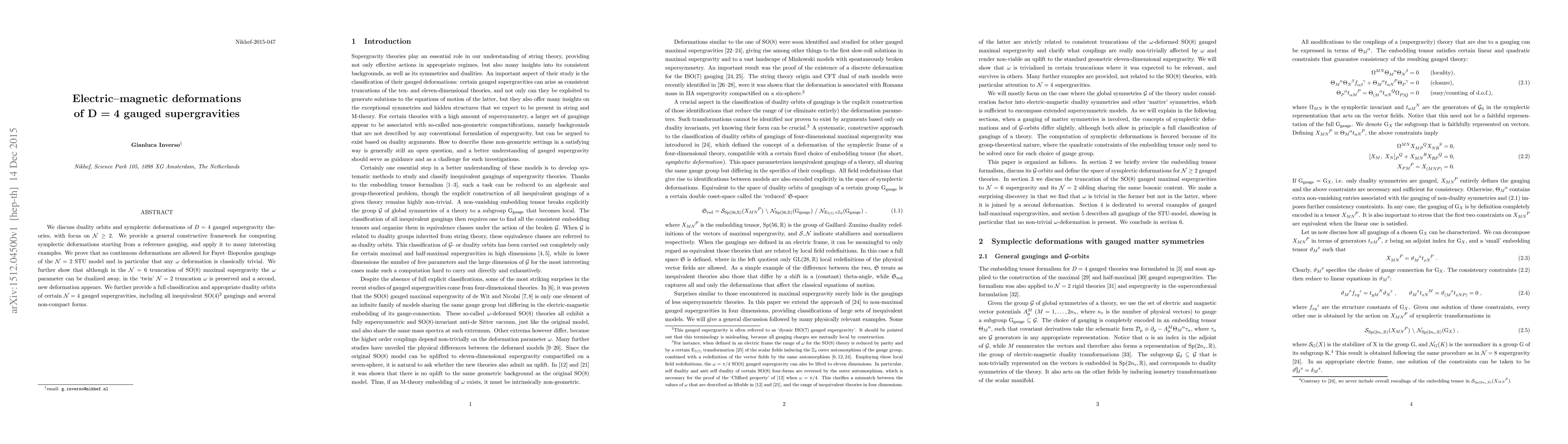 We discuss duality orbits and symplectic deformations of D=4 gauged supergravity theories, with focus on N$\ge$2. We provide a general constructive framework for computing symplectic deformations starting from a reference gauging, and apply it to many interesting examples. We prove that no continuous deformations are allowed for Fayet-Iliopoulos gaugings of the N=2 STU model and in particular that any $\omega$ deformation is classically trivial. We further show that although in the N=6 truncation of SO(8) maximal supergravity the $\omega$ parameter can be dualized away, in the 'twin' N=2 truncation $\omega$ is preserved and a second, new deformation appears. We further provide a full classification and appropriate duality orbits of certain N=4 gauged supergravities, including all inequivalent SO(4)$^2$ gaugings and several non-compact forms.