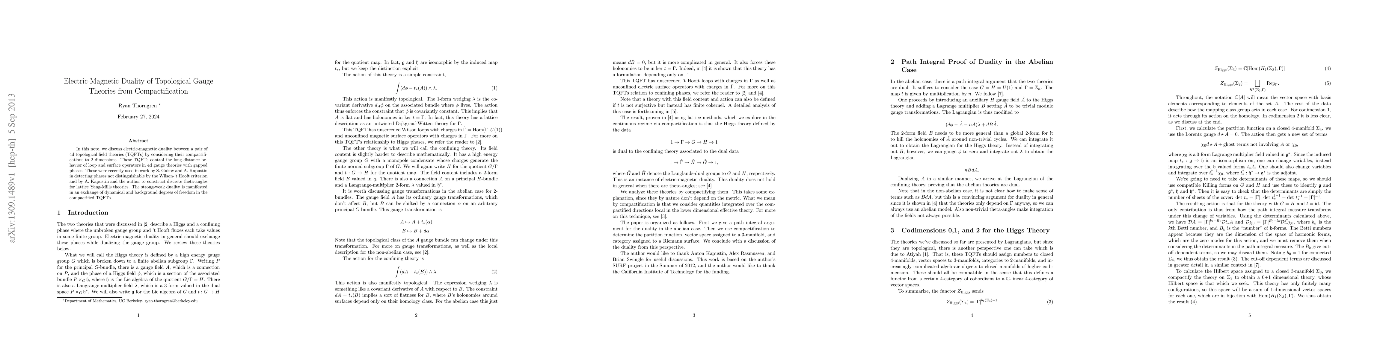 This paper explores the electric-magnetic duality in 4d topological gauge theories through their 2d compactifications, revealing the exchange of dynamical and background degrees of freedom. The findings are applied to detect non-distinguishable phases in 4d gauge theories and construct discrete theta-angles for lattice Yang-Mills theories.