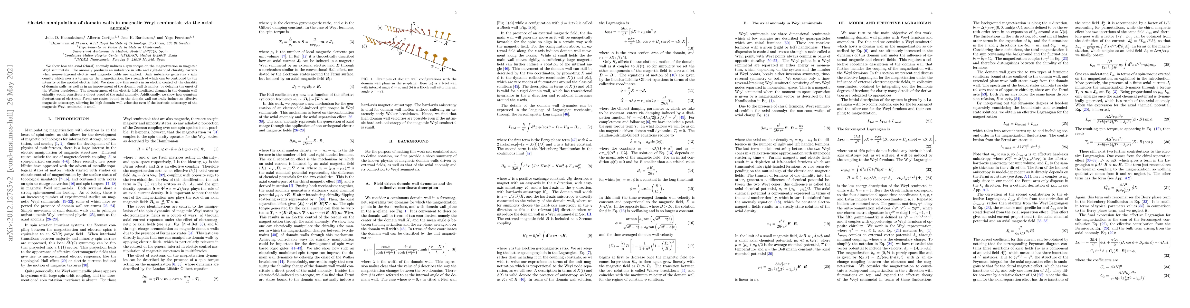 This research demonstrates that the axial anomaly can generate a spin torque on magnetization in magnetic Weyl semimetals, enabling electric field control over domain wall chirality and dynamics. Quantum fluctuations further enhance domain wall velocities, providing a method to directly observe the axial anomaly.