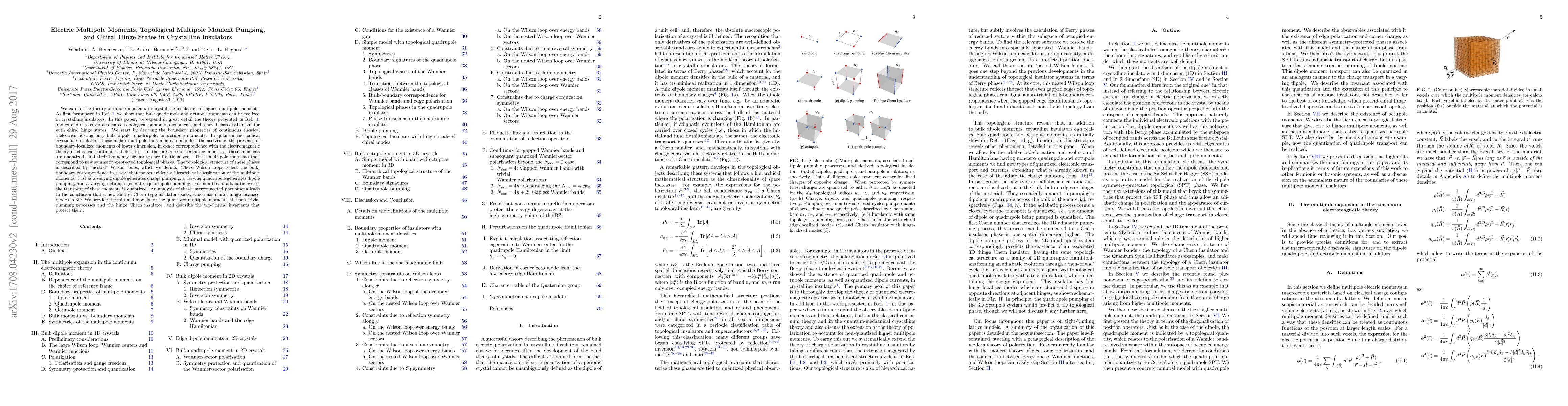 We extend the theory of dipole moments in crystalline insulators to higher multipole moments. In this paper, we expand in great detail the theory presented in Ref. 1, and extend it to cover associated topological pumping phenomena, and a novel class of 3D insulator with chiral hinge states. In quantum-mechanical crystalline insulators, higher multipole bulk moments manifest themselves by the presence of boundary-localized moments of lower dimension, in exact correspondence with the electromagnetic theory of classical continuous dielectrics. In the presence of certain symmetries, these moments are quantized, and their boundary signatures are fractionalized. These multipole moments then correspond to new SPT phases. The topological structure of these phases is described by "nested" Wilson loops, which reflect the bulk-boundary correspondence in a way that makes evident a hierarchical classification of the multipole moments. Just as a varying dipole generates charge pumping, a varying quadrupole generates dipole pumping, and a varying octupole generates quadrupole pumping. For non-trivial adiabatic cycles, the transport of these moments is quantized. An analysis of these interconnected phenomena leads to the conclusion that a new kind of Chern-type insulator exists, which has chiral, hinge-localized modes in 3D. We provide the minimal models for the quantized multipole moments, the non-trivial pumping processes and the hinge Chern insulator, and describe the topological invariants that protect them.