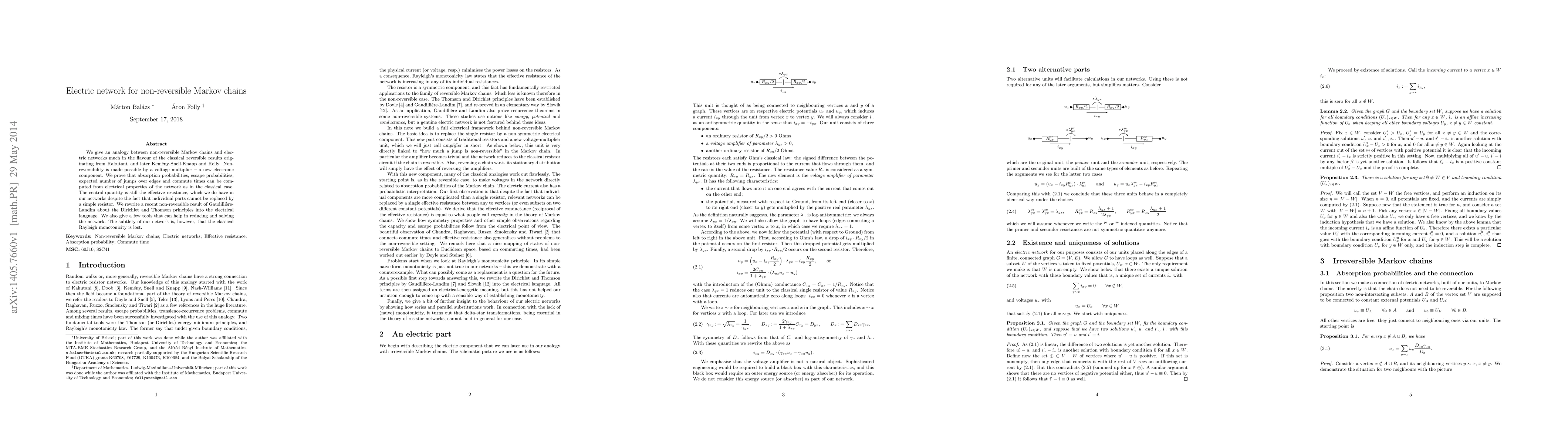 This paper establishes an analogy between non-reversible Markov chains and electric networks, introducing a voltage multiplier to account for non-reversibility. It demonstrates that various probabilistic measures can be derived from the electrical properties of the network, maintaining the central role of effective resistance despite the loss of classical Rayleigh monotonicity.