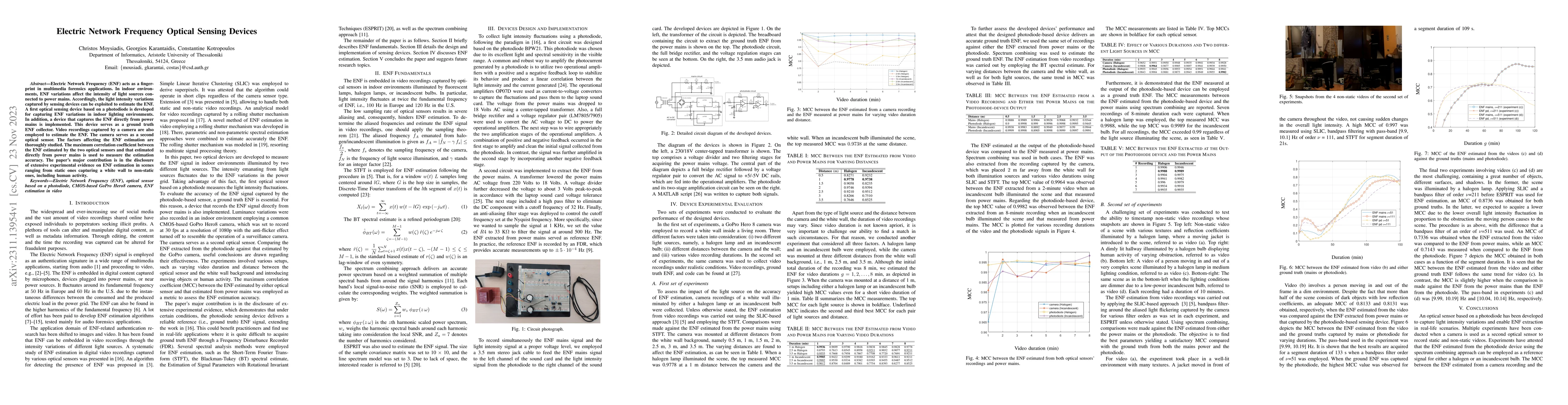 This paper develops optical sensing devices for capturing Electric Network Frequency (ENF) variations in indoor environments, comparing ENF estimates from photodiode sensors and camera recordings to a ground truth device. The study provides extensive experimental evidence on ENF estimation accuracy across static and dynamic scenes.
