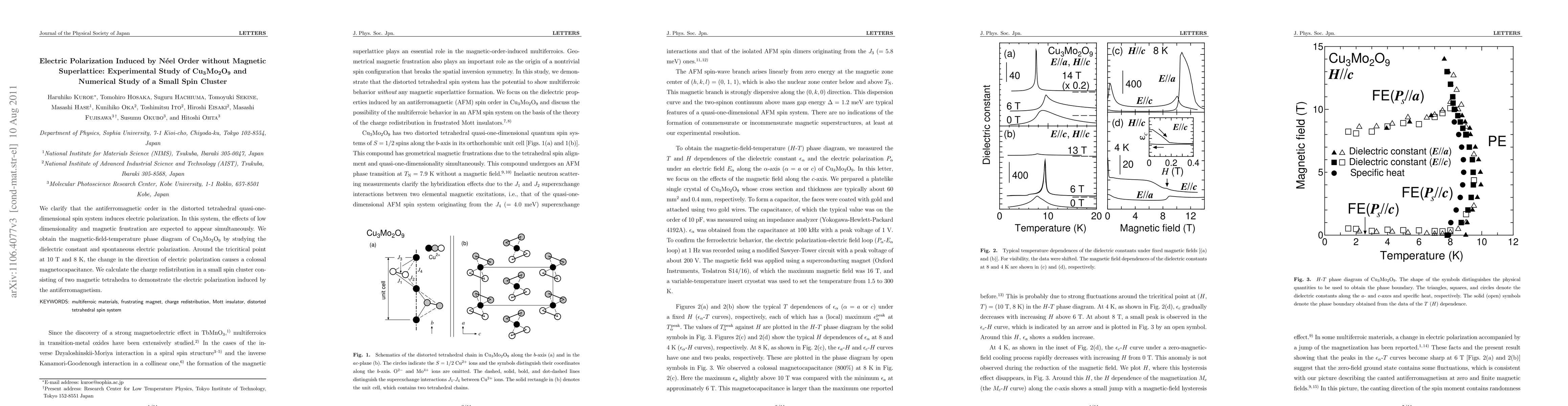 We clarify that the antiferromagnetic order in the distorted tetrahedral quasi-one dimensional spin system induces electric polarizations. In this system, the effects of the low dimensionality and the magnetic frustration are expected to appear simultaneously. We obtain the magnetic-field-temperature phase diagram in Cu3Mo2O9 by studying the dielectric constant and the spontaneous electric polarization. Around the tricritical point at 10 T and 8 K, the change of the direction in the electric polarization causes a colossal magnetocapacitance. We calculate the charge redistribution in the small spin cluster consisting of two magnetic tetrahedra to demonstrate the electric polarization induced by the antiferromagnetism.