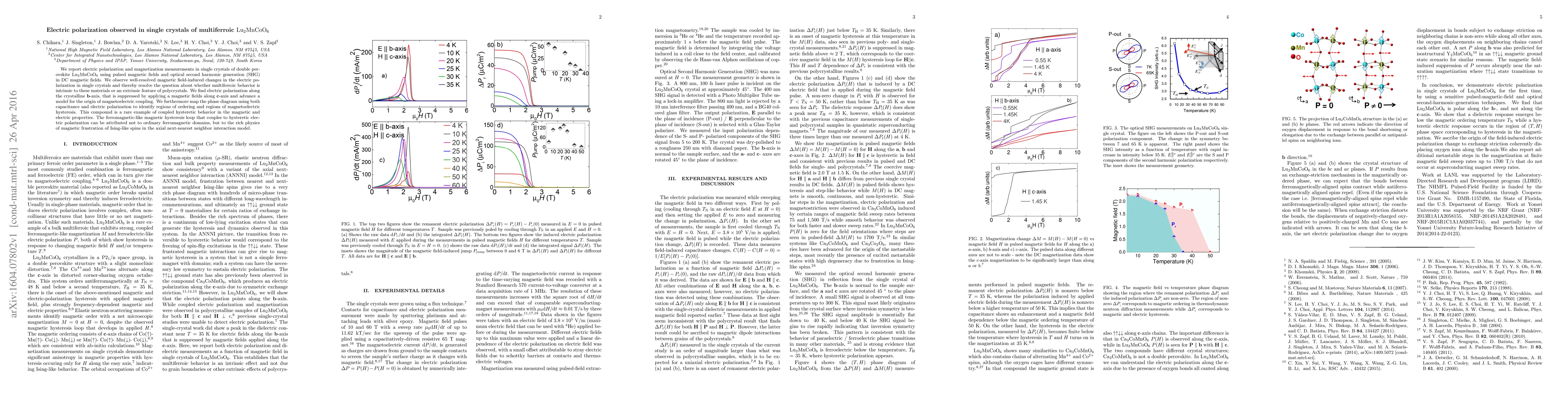 We report electric polarization and magnetization measurements in single crystals of double perovskite Lu2MnCoO6 using pulsed magnetic fields and optical second harmonic generation (SHG) in DC magnetic fields. we observe well-resolved magnetic field-induced changes in the electric polarization in single crystals and thereby resolve the question about whether multiferroic behavior is intrinsic to these materials or an extrinsic feature of polycrystals. We find electric polarization along the crystalline b-axis, that is suppressed by applying a magnetic fields along c-axis and advance a model for the origin of magnetoelectric coupling. We furthermore map the phase diagram using both capacitance and electric polarization to identify regions of ordering and regions of magnetoelectric hysteresis. This compound is a rare example of coupled hysteretic behavior in the magnetic and electric properties. The ferromagnetic-like magnetic hysteresis loop that couples to hysteretic polarization can be attributed not to ordinary ferromagnetic domains, but to the rich physics of magnetic frustration of Ising-like spins in the axial next-nearest neighbor interaction model.