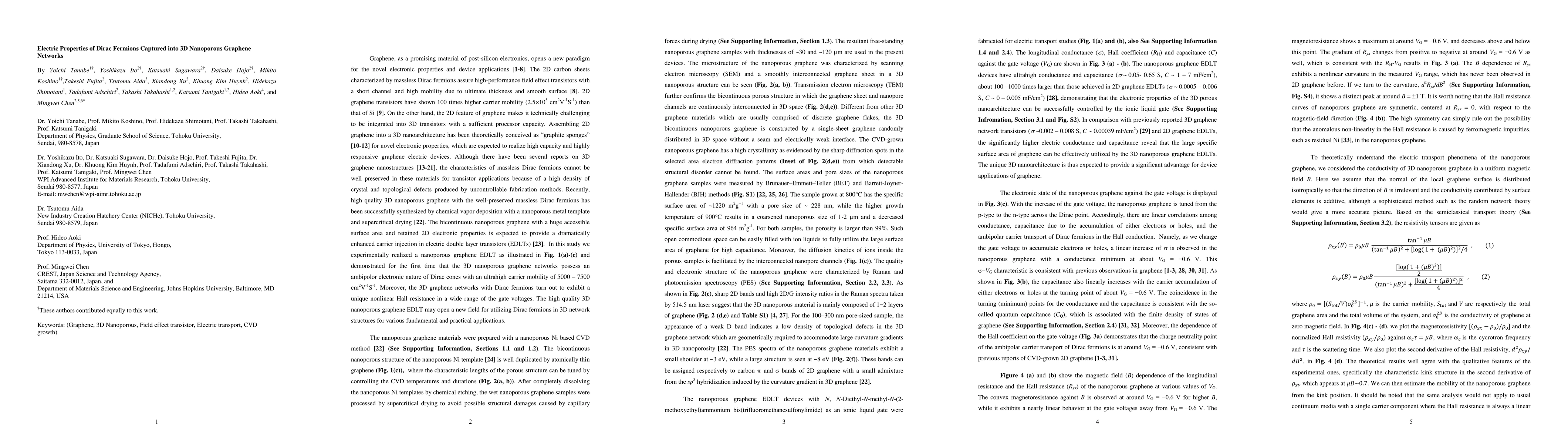 This paper reports the successful integration of Dirac fermions into 3D nanoporous graphene networks, achieving high carrier mobility and significantly enhanced electric conductance and capacitance compared to 2D graphene devices, while preserving the unique electronic properties of Dirac cones. The 3D structure also exhibits a unique nonlinear Hall resistance, suggesting potential for advanced electronic applications.