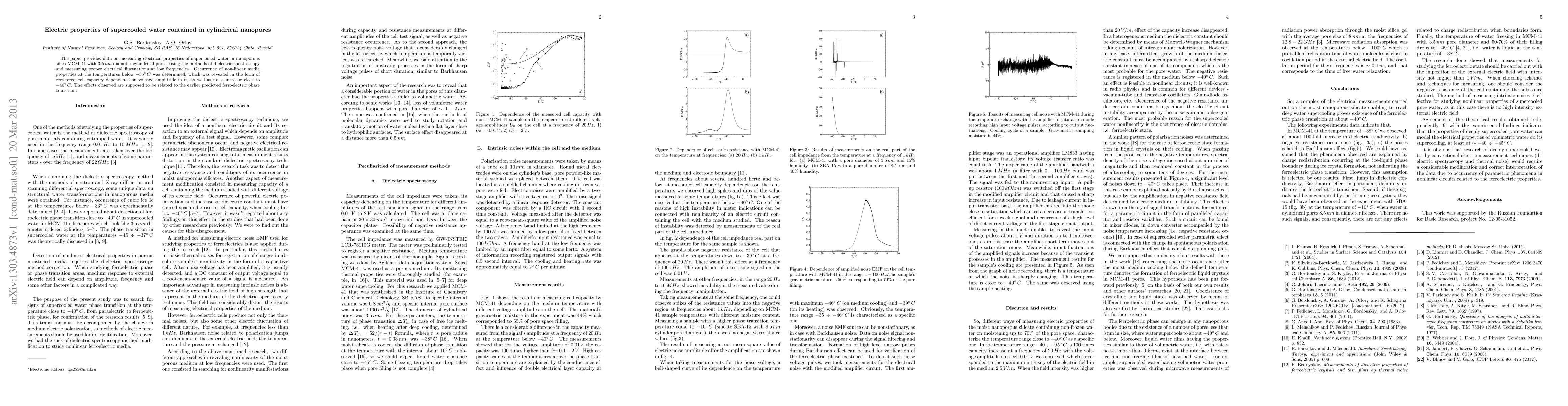 The paper provides data on measuring electrical properties of supercooled water in nanoporous silica MCM-41 with 3.5 nm diameter cylindrical pores, using the methods of dielectric spectroscopy and measuring proper electrical fluctuations at low frequencies. Occurrence of non-linear media properties at the temperatures below -35 C was determined, which was revealed in the form of registered cell capacity dependence on voltage amplitude in it, as well as noise increase close to -40 C. The effects observed are supposed to be related to the earlier predicted ferroelectric phase transition.