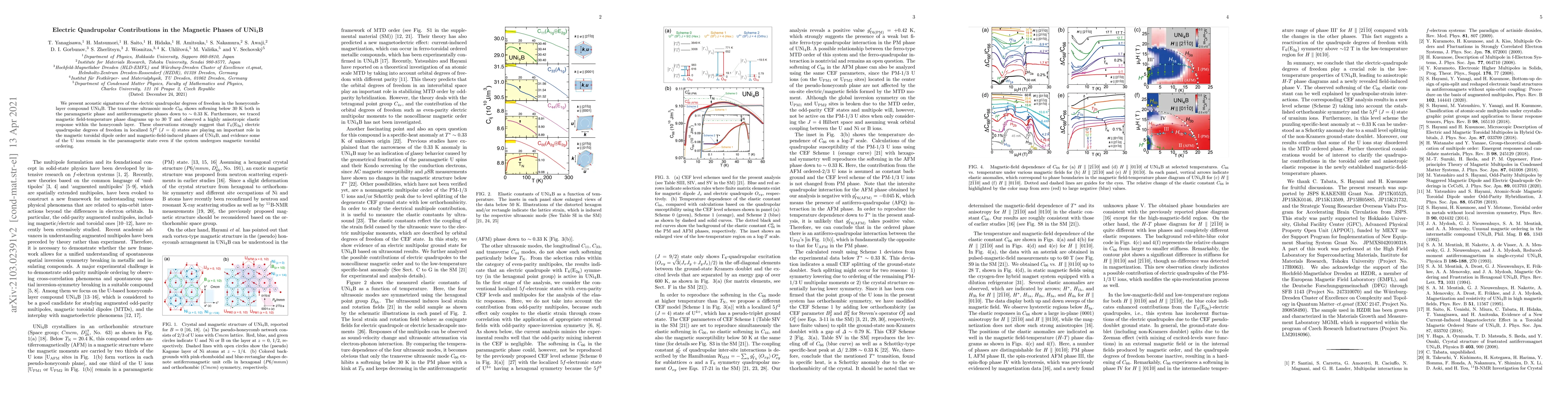 We present acoustic signatures of the electric quadrupolar degrees of freedom in the honeycomb-layer compound UNi$_4$B. The transverse ultrasonic mode $C_{66}$ shows softening below 30 K both in the paramagnetic phase and antiferromagnetic phases down to $\sim0.33$ K. Furthermore, we traced magnetic field-temperature phase diagrams up to 30 T and observed a highly anisotropic elastic response within the honeycomb layer. These observations strongly suggest that $\Gamma_6$(E$_{\rm 2g}$) electric quadrupolar degrees of freedom in localized $5f^2$ ($J = 4$) states are playing an important role in the magnetic toroidal dipole order and magnetic-field-induced phases of UNi$_4$B, and evidence some of the U ions remain in the paramagnetic state even if the system undergoes magnetic toroidal ordering.