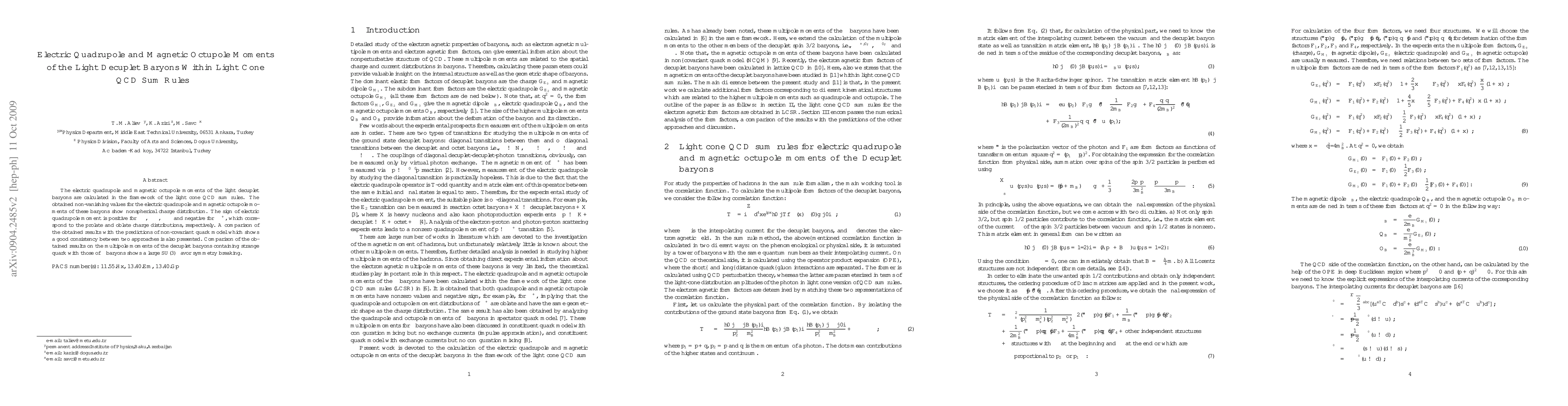 This paper calculates the electric quadrupole and magnetic octupole moments of light decuplet baryons using light cone QCD sum rules, revealing nonspherical charge distributions. Results show positive electric quadrupole moments for $\Omega^-$, $\Xi^{*-}$, $\Sigma^{*-}$ and negative for $\Sigma^{*+}$, indicating prolate and oblate distributions, respectively, and align well with non-covariant quark model predictions.