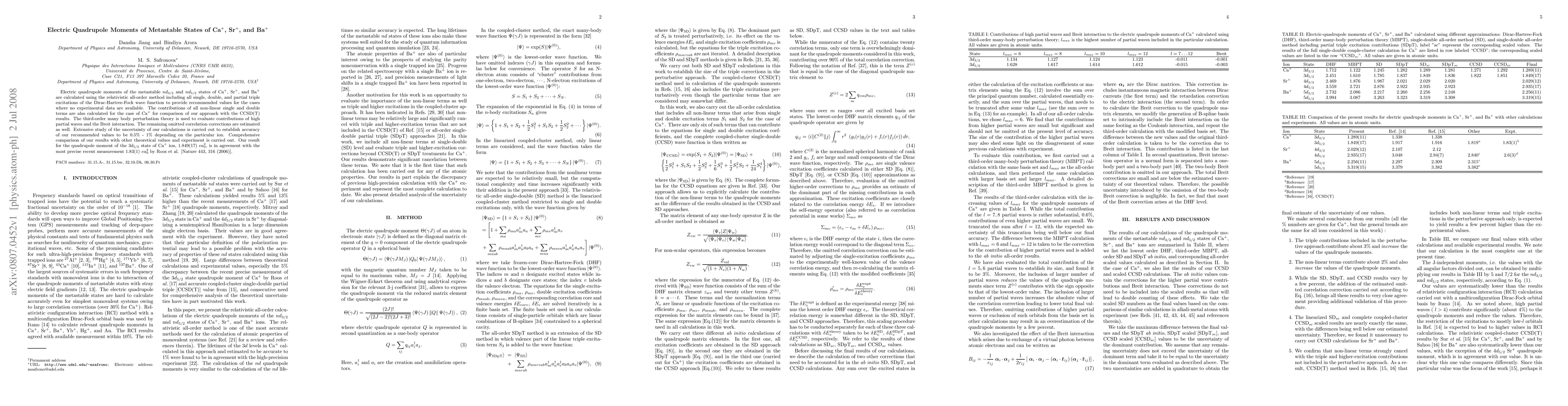 Electric quadrupole moments of the metastable nd3/2 and nd5/2 states of Ca+, Sr+, and Ba+ are calculated using the relativistic all-order method including all single, double, and partial triple excitations of the Dirac-Hartree-Fock wave function to provide recommended values for the cases where no experimental data are available. The contributions of all non-linear single and double terms are also calculated for the case of Ca+ for comparison of our approach with the CCSD(T) results. The third-order many body perturbation theory is used to evaluate contributions of high partial waves and the Breit interaction. The remaining omitted correlation corrections are estimated as well. Extensive study of the uncertainty of our calculations is carried out to establish accuracy of our recommended values to be 0.5% - 1% depending on the particular ion. Comprehensive comparison of our results with other theoretical values and experiment is carried out. Our result for the quadrupole moment of the 3d5/2 state of Ca+ ion, 1.849(17)ea_0^2, is in agreement with the most precise recent measurement 1.83(1)ea_0^2 by Roos et al. [Nature 443, 316 (2006)].