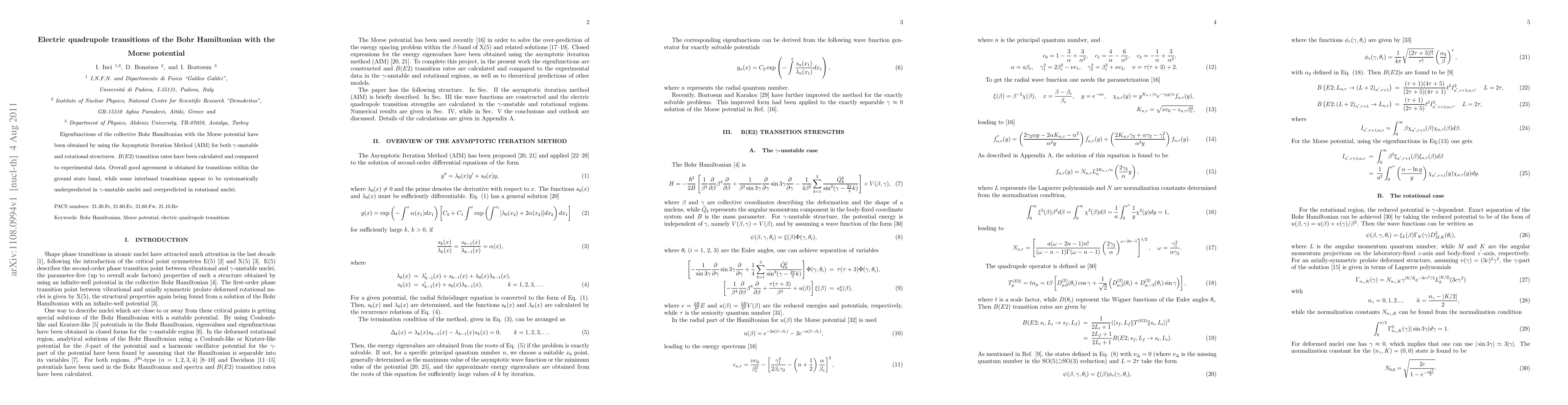 This paper uses the Asymptotic Iteration Method to obtain eigenfunctions of the Bohr Hamiltonian with the Morse potential, calculating B(E2) transition rates and comparing them to experimental data. While good agreement is found for ground state band transitions, discrepancies arise for interband transitions in gamma-unstable and rotational nuclei.