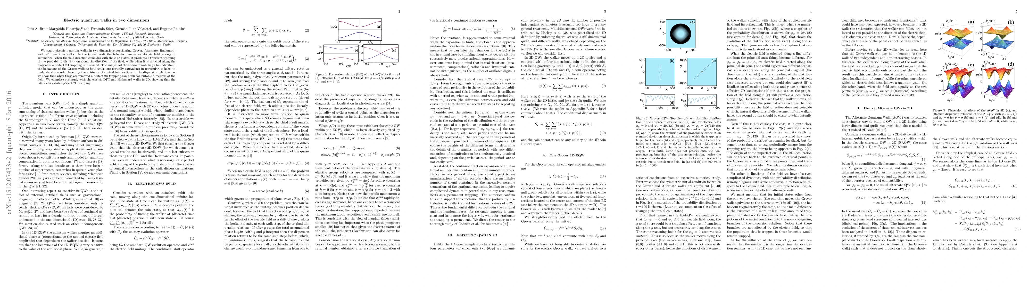 This paper investigates the effects of electric fields on various two-dimensional quantum walks, including Grover, Alternate, Hadamard, and DFT walks. It finds that electric fields can cause transient trapping in probability distributions along field directions, while perfect 2D trapping is achievable under specific conditions, particularly when conical intersections are removed.