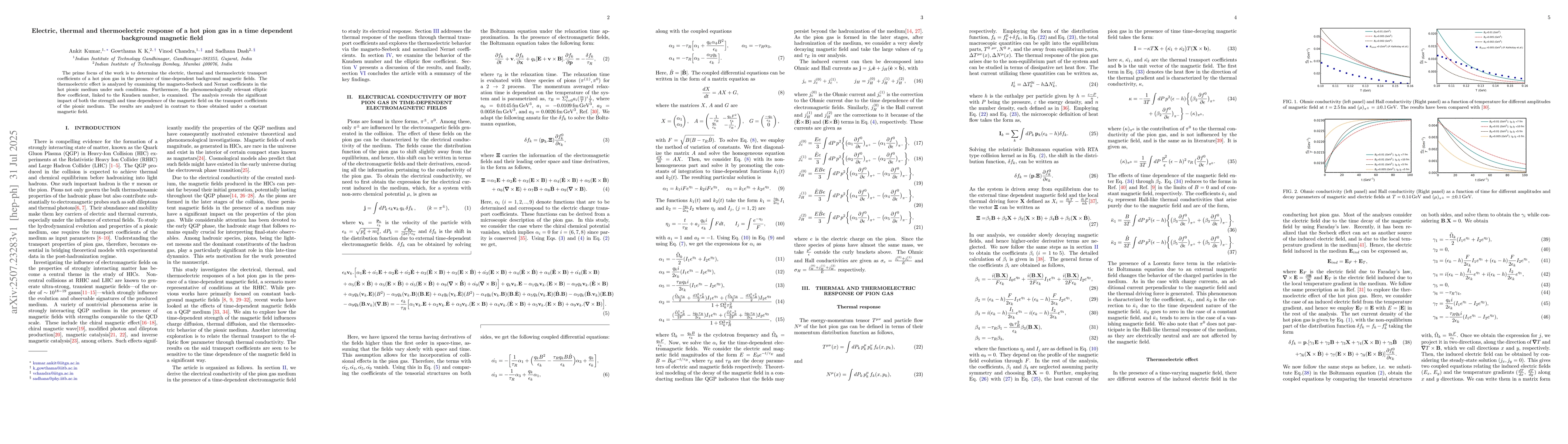 The prime focus of the work is to determine the electric, thermal and thermoelectric transport coefficients of a hot pion gas in the presence of time-dependent background magnetic fields. The thermoelectric effect is analyzed by examining the magneto-Seebeck and Nernst coefficients in the hot pionic medium under such conditions. Furthermore, the phenomenologically relevant elliptic flow coefficient, linked to the Knudsen number, is examined. The analysis reveals the significant impact of both the strength and time dependence of the magnetic field on the transport coefficients of the pionic medium. The results are analyzed in contrast to those obtained under a constant magnetic field.