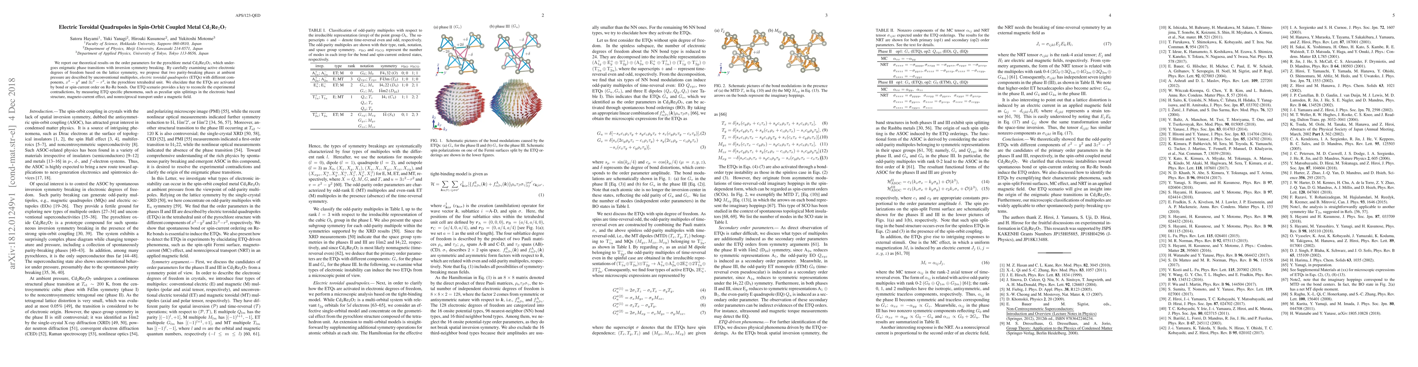 We report our theoretical results on the order parameters for the pyrochlore metal Cd$_2$Re$_2$O$_7$, which undergoes enigmatic phase transitions with inversion symmetry breaking. By carefully examining active electronic degrees of freedom based on the lattice symmetry, we propose that two parity-breaking phases at ambient pressure are described by unconventional multipoles, electric toroidal quadrupoles (ETQs) with different components, $x^2-y^2$ and $3z^2-r^2$, in the pyrochlore tetrahedral unit. We elucidate that the ETQs are activated by bond or spin-current order on Re-Re bonds. Our ETQ scenario provides a key to reconcile the experimental contradictions, by measuring ETQ specific phenomena, such as peculiar spin splittings in the electronic band structure, magneto-current effect, and nonreciprocal transport under a magnetic field.