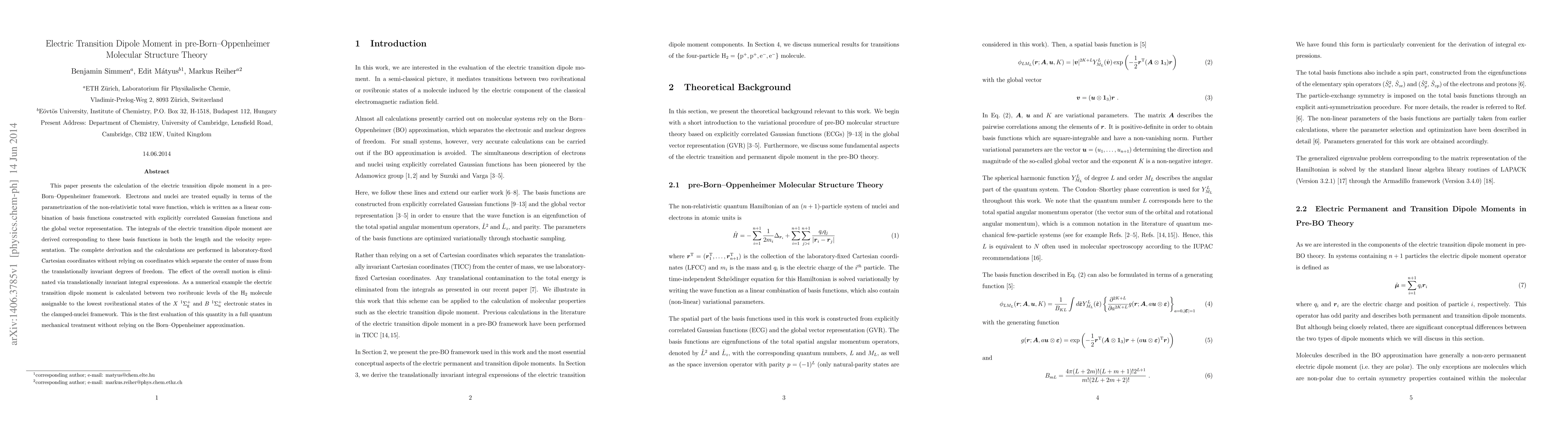 This paper calculates the electric transition dipole moment in a pre-Born-Oppenheimer framework, treating electrons and nuclei equally, and derives corresponding integrals in both length and velocity representations. The first full quantum mechanical evaluation of this quantity for H2 is performed without relying on the Born-Oppenheimer approximation.