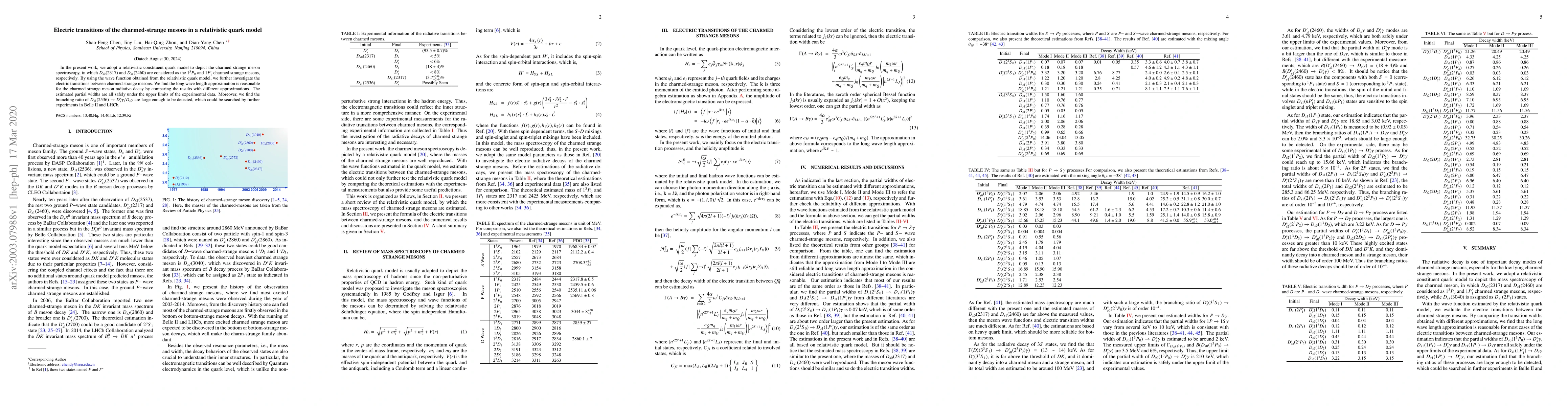 This paper uses a relativistic quark model to study the spectroscopy and electric transitions of charmed-strange mesons, specifically $D_{s0}(2317)$ and $D_{s1}(2460)$. The model's predictions for radiative decay widths are consistent with experimental data and suggest promising detection prospects for the $D_{s1}(2536) \to D_s^\ast \gamma$ transition in future experiments.
