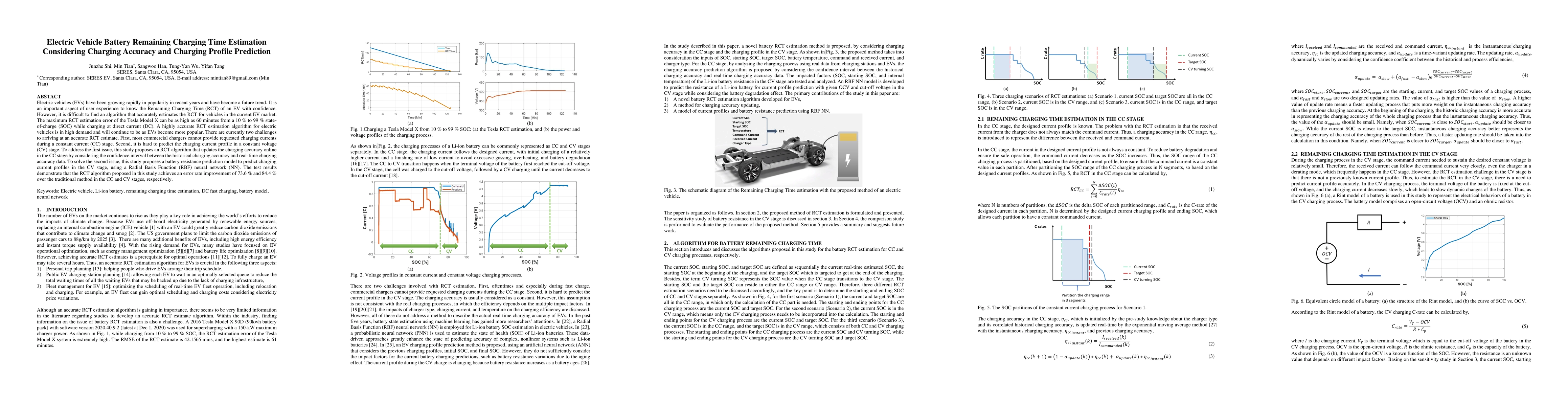 Electric vehicles (EVs) have been growing rapidly in popularity in recent years and have become a future trend. It is an important aspect of user experience to know the Remaining Charging Time (RCT) of an EV with confidence. However, it is difficult to find an algorithm that accurately estimates the RCT for vehicles in the current EV market. The maximum RCT estimation error of the Tesla Model X can be as high as 60 minutes from a 10 % to 99 % state-of-charge (SOC) while charging at direct current (DC). A highly accurate RCT estimation algorithm for electric vehicles is in high demand and will continue to be as EVs become more popular. There are currently two challenges to arriving at an accurate RCT estimate. First, most commercial chargers cannot provide requested charging currents during a constant current (CC) stage. Second, it is hard to predict the charging current profile in a constant voltage (CV) stage. To address the first issue, this study proposes an RCT algorithm that updates the charging accuracy online in the CC stage by considering the confidence interval between the historical charging accuracy and real-time charging accuracy data. To solve the second issue, this study proposes a battery resistance prediction model to predict charging current profiles in the CV stage, using a Radial Basis Function (RBF) neural network (NN). The test results demonstrate that the RCT algorithm proposed in this study achieves an error rate improvement of 73.6 % and 84.4 % over the traditional method in the CC and CV stages, respectively.