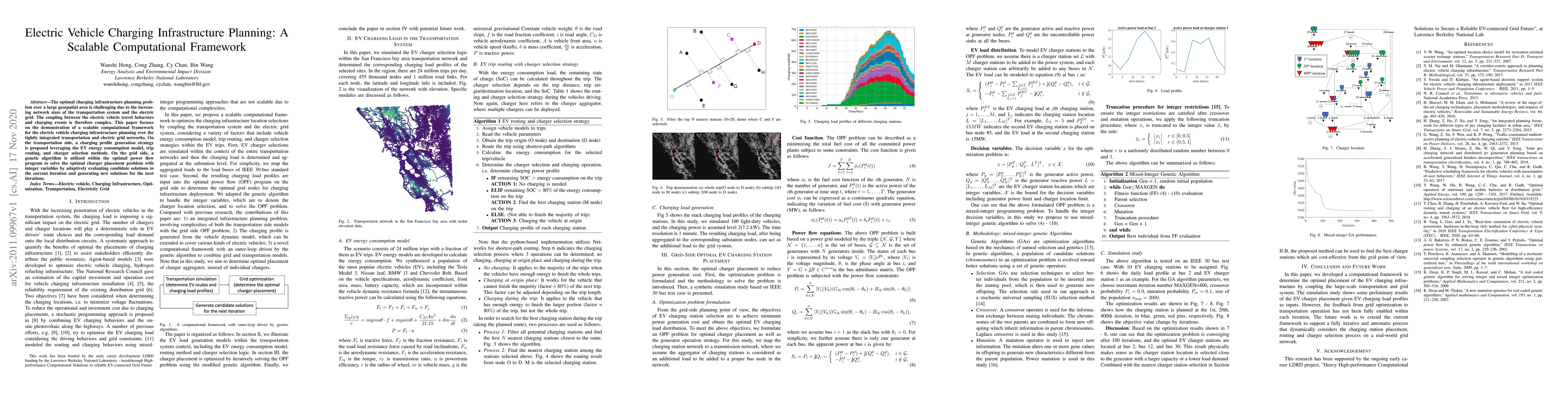 This paper presents a scalable computational framework for planning electric vehicle charging infrastructure, integrating transportation and electric grid networks. It employs a charging profile generation strategy based on EV energy consumption and trip routing, and uses a genetic algorithm within the optimal power flow program to optimize charger placement.
