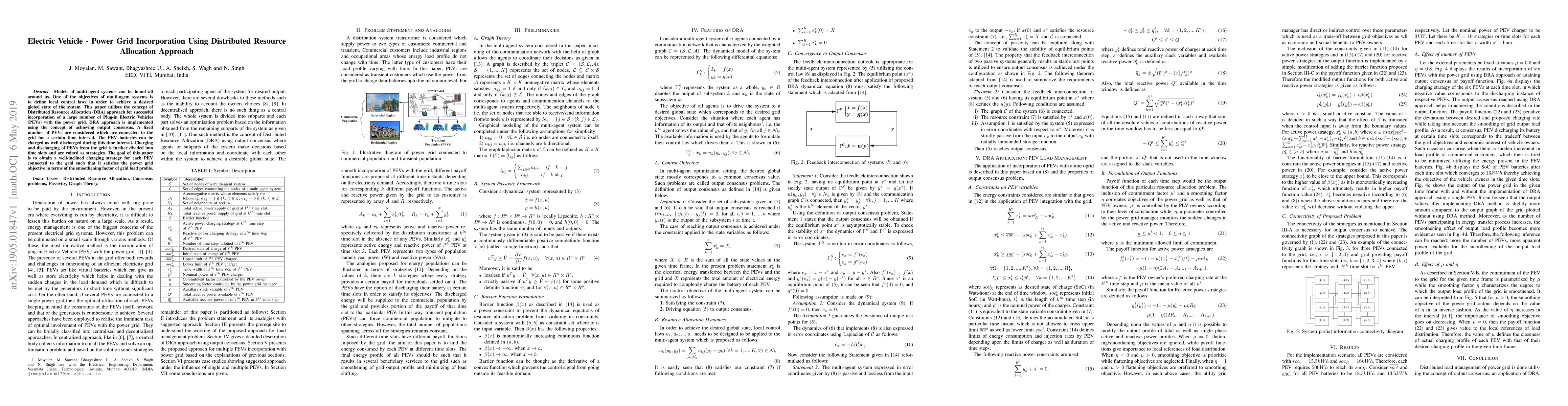 Models of multi-agent systems can be found all around us. One of the objectives of multi-agent systems is to define local control laws in order to achieve a desired global state of the system. This paper utilises the concept of Distributed Resource Allocation (DRA) approach for successful incorporation of a large number of Plug-in Electric Vehicles (PEVs) with the power grid. DRA approach is implemented using the concept of achieving output consensus. A fixed number of PEVs are considered which are connected to the grid for a certain time interval. The PEV batteries can be charged as well discharged during this time interval. Charging and discharging of PEVs from the grid is further divided into time slots and are coined as strategies. The goal of this paper is to obtain a well-inclined charging strategy for each PEV connected to the grid such that it satisfies the power grid objective in terms of the smoothening factor of grid load profile.