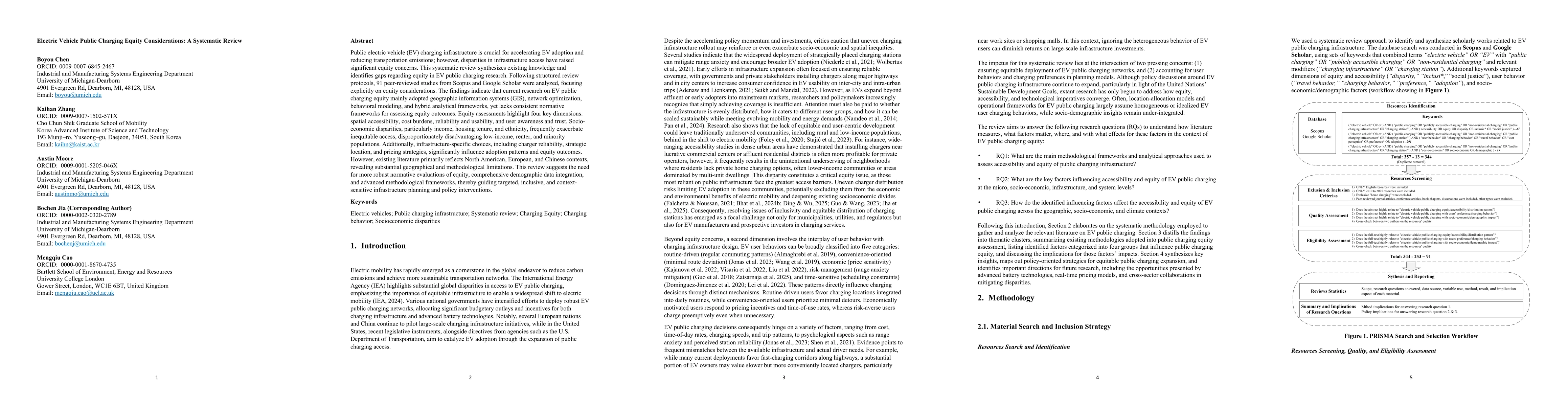 This systematic review of 91 studies on electric vehicle (EV) charging equity finds that while research uses GIS, optimization, and modeling, it lacks consistent normative frameworks for equity assessment. Key equity dimensions include accessibility, cost, reliability, and user trust, with socio-economic factors and infrastructure choices significantly impacting equity. The review highlights a geographical bias towards North America, Europe, and China, suggesting a need for more robust evaluations, demographic data integration, and advanced methodologies for inclusive infrastructure planning and policy.