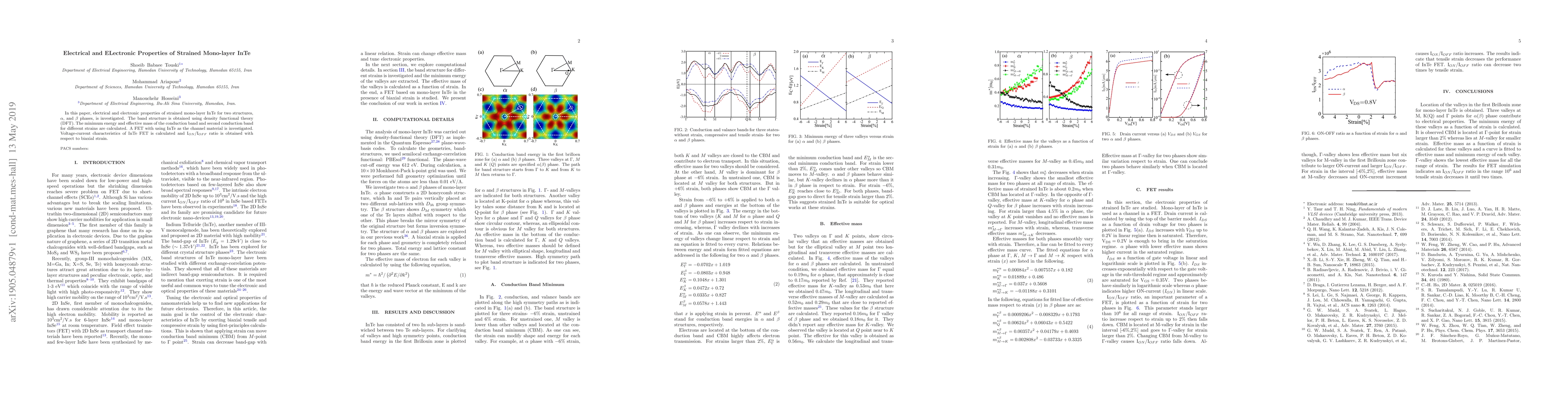 In this paper, electrical and electronic properties of strained mono-layer InTe for two structures, $\alpha$, and $\beta$ phases, is investigated. The band structure is obtained using density functional theory (DFT). The minimum energy and effective mass of the conduction band and second conduction band for different strains are calculated. A FET with using InTe as the channel material is investigated. Voltage-current characteristics of InTe FET is calculated and I$_{ON}$/I$_{OFF}$ ratio is obtained with respect to biaxial strain.